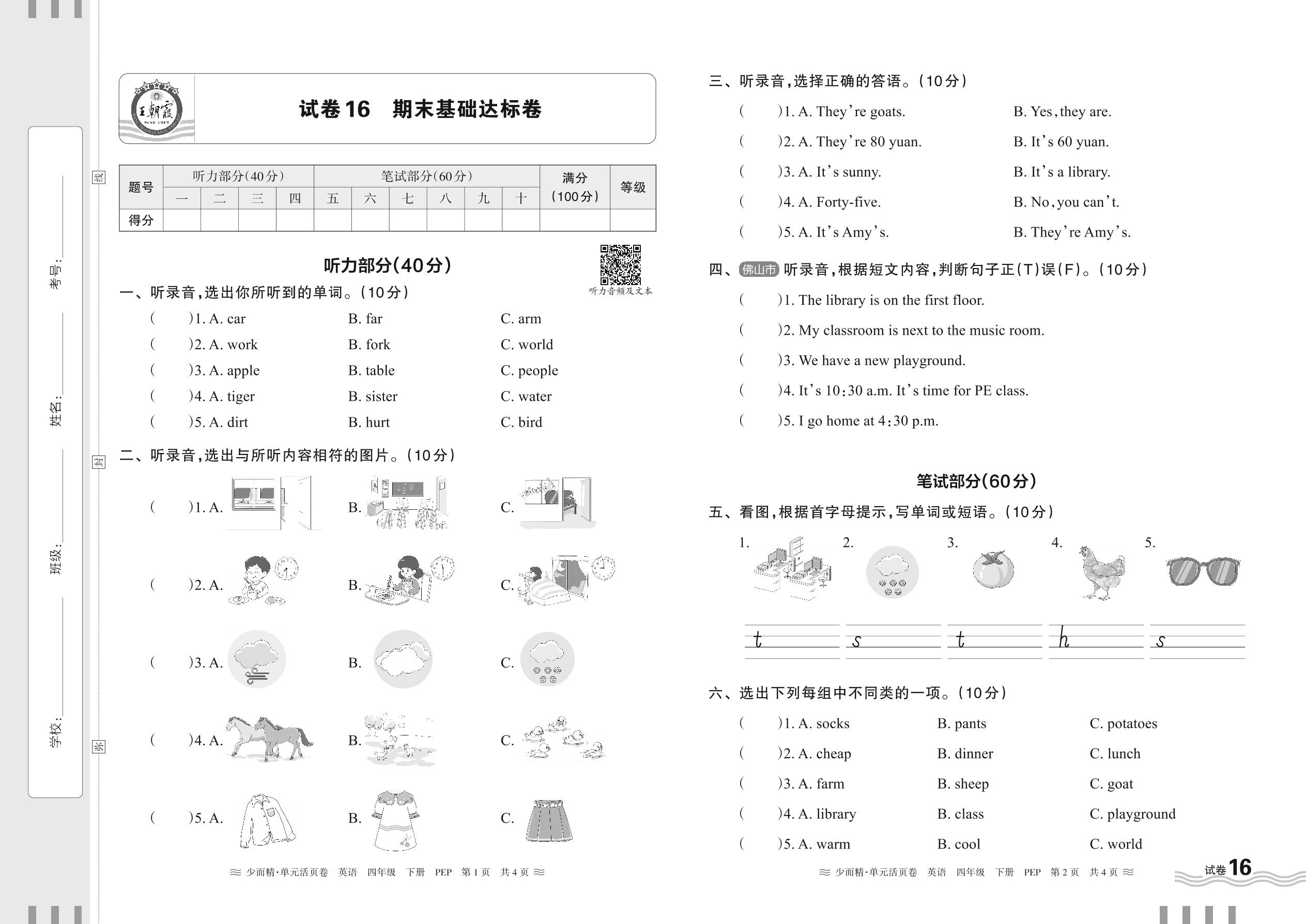 四年级英语人教PEP版(三起始)下册期末卷