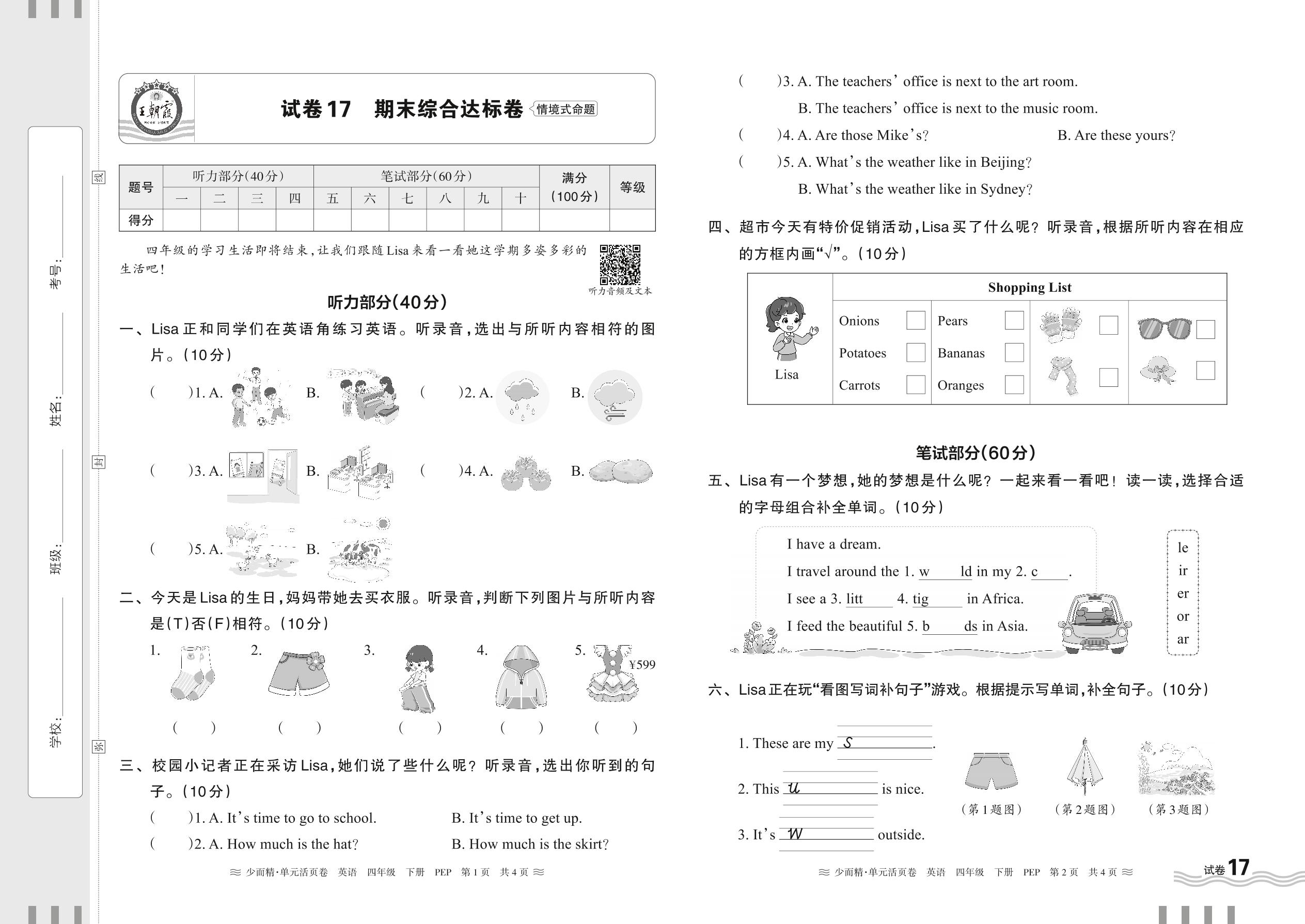 四年级英语人教PEP版(三起始)下册期末卷