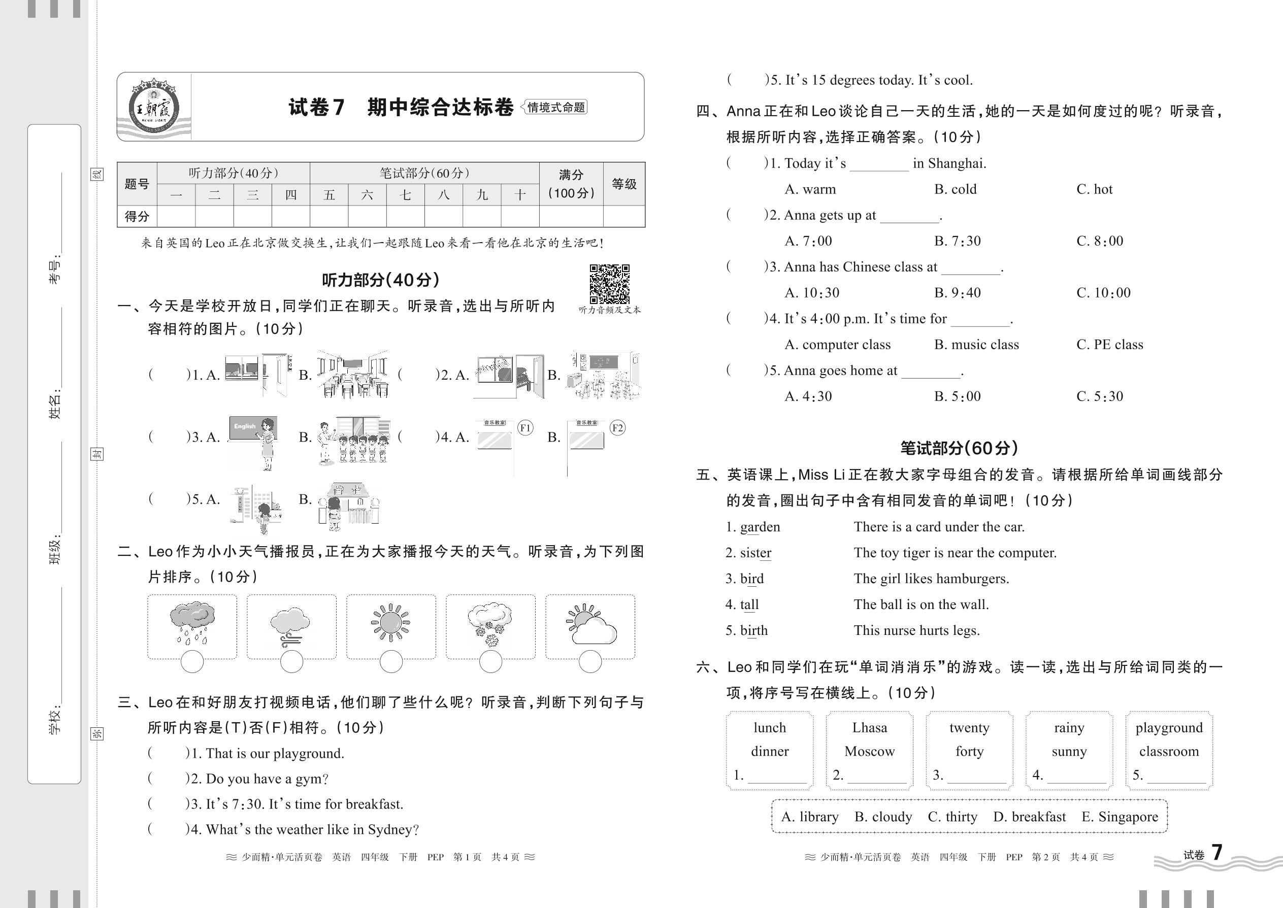 2024春下册四年级英语人教PEP版 期中综合达标卷【7】