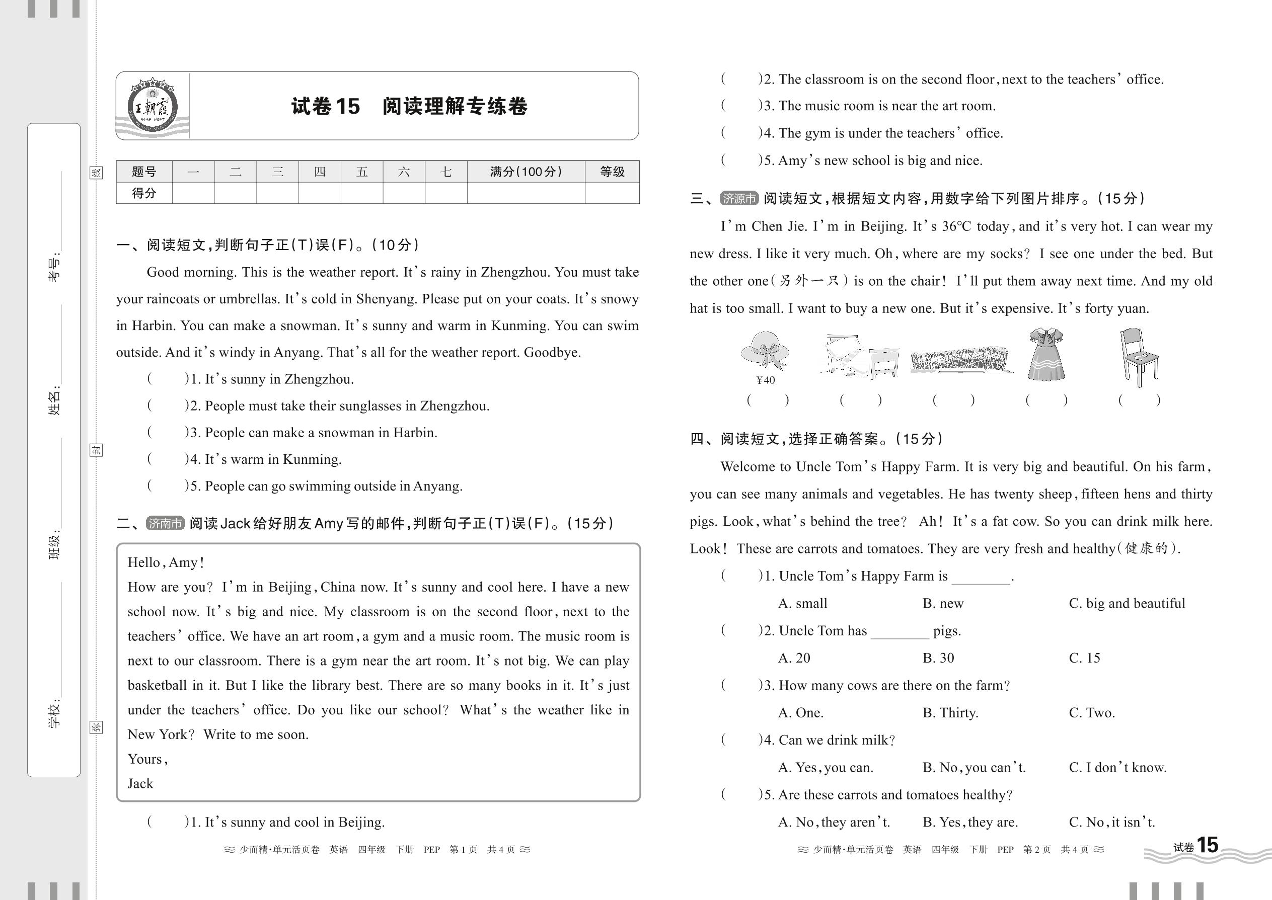 2024春下册四年级英语人教PEP版 阅读理解专练卷【15】