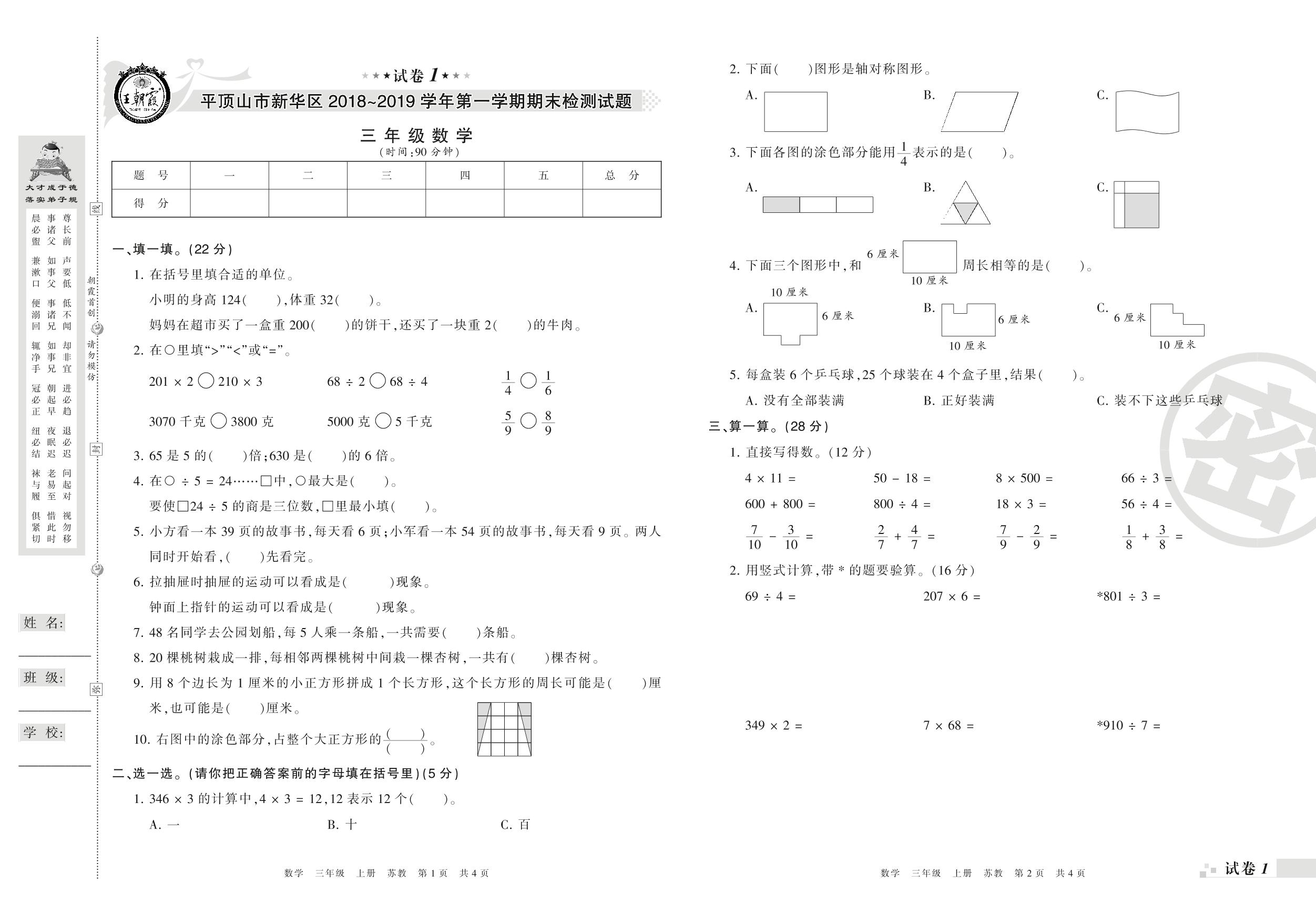 2018-2019学年第一学期平顶山市新华区三年级数学试卷(苏教版)_R21080495052【1】
