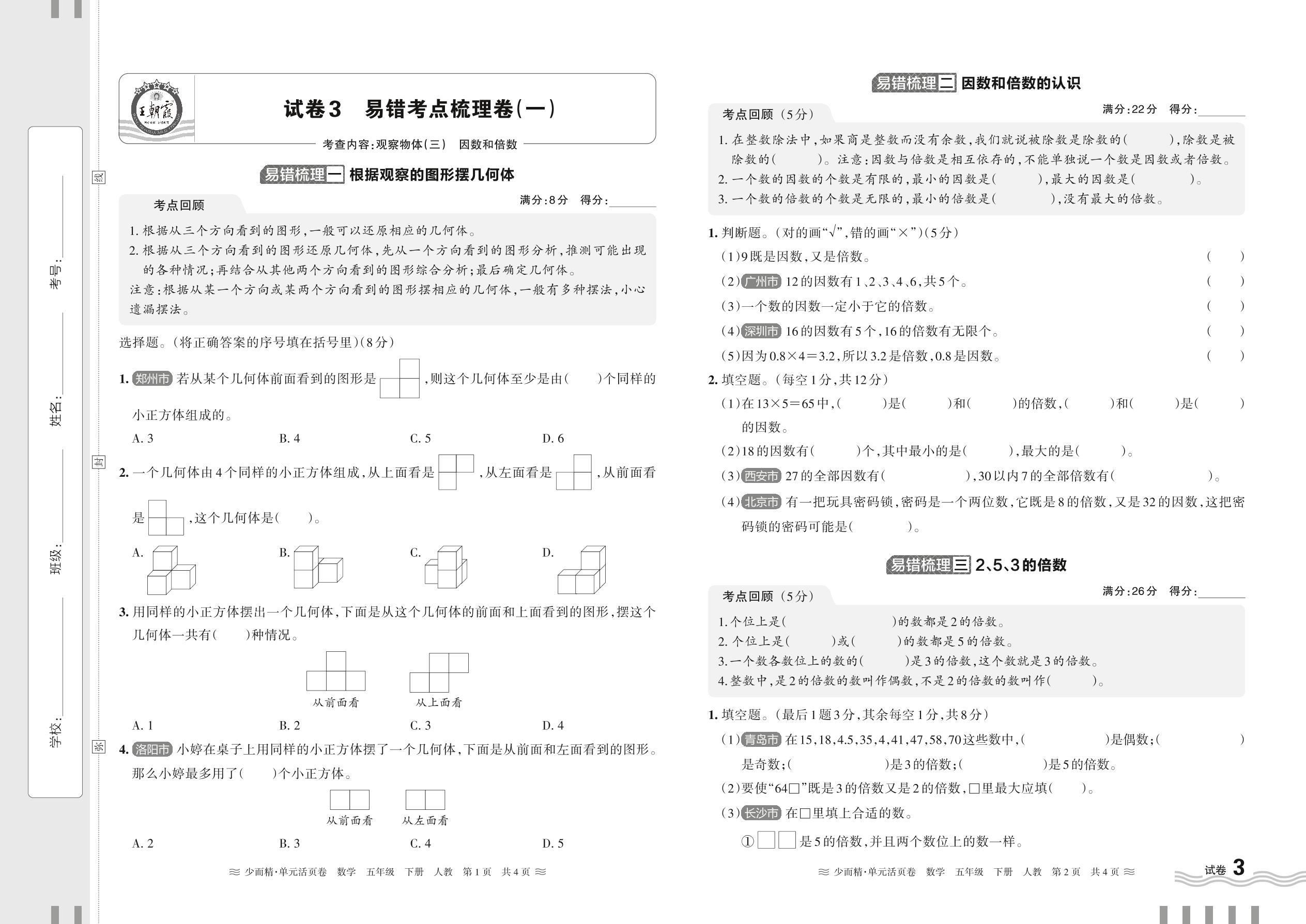 2024春下册五年级数学人教版 易错考点梳理卷——观察物体(三) 因数和倍数【3】