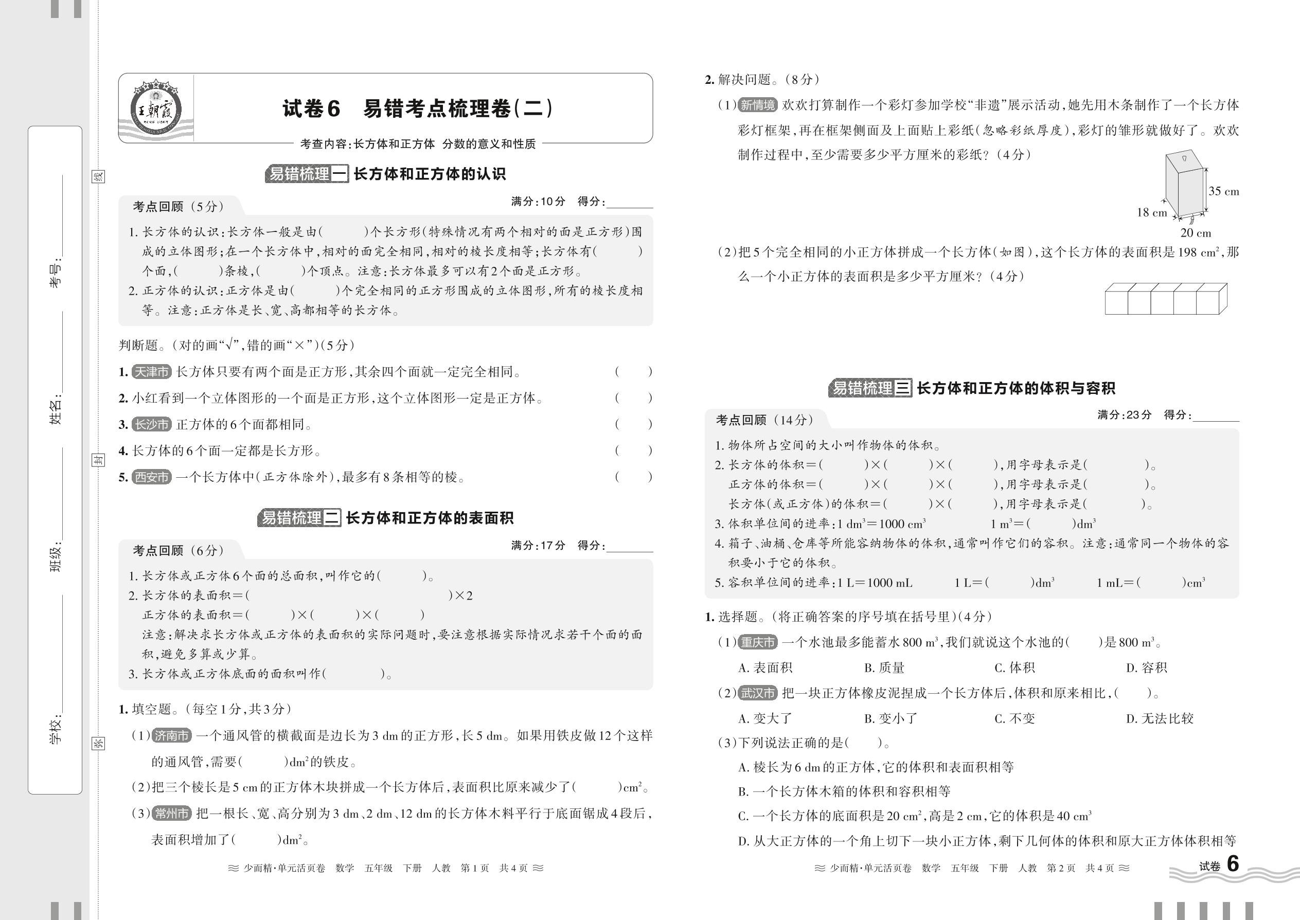 2024春下册五年级数学人教版 易错考点梳理卷(长方体和正方体 分数的意义和性质)【6】