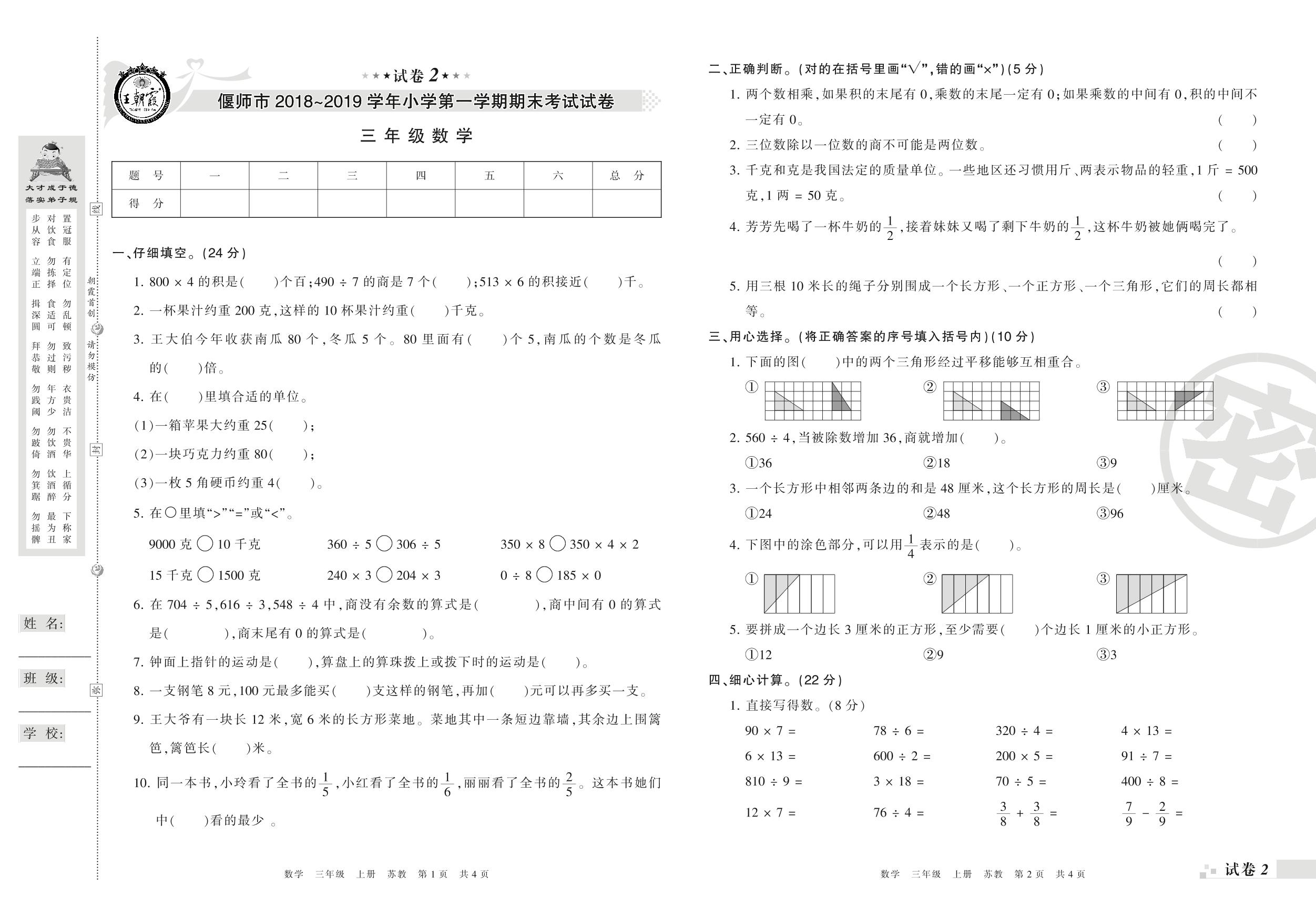 2018-2019学年第一学期偃师市三年级数学试卷(苏教版)【2】