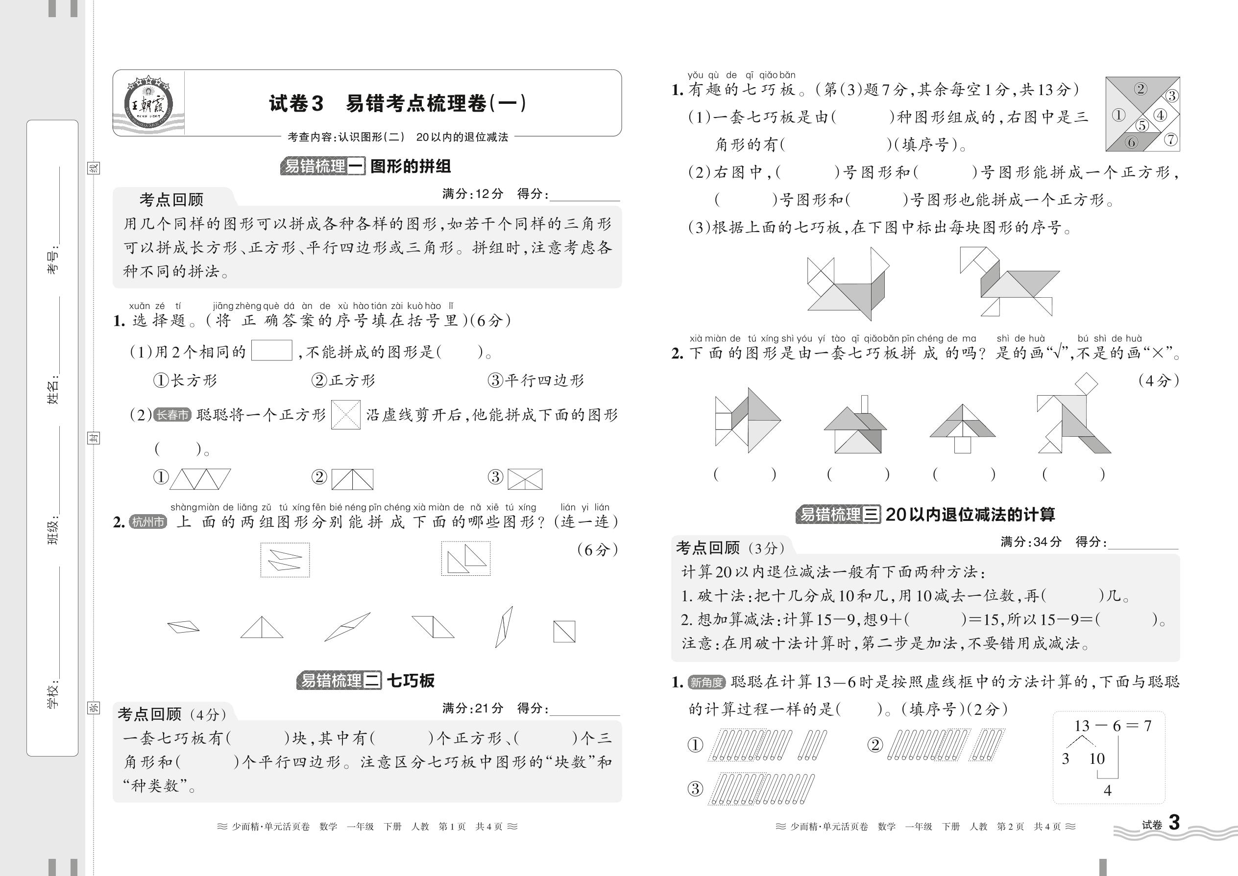 2024春下册一年级数学人教版 易错考点梳理卷——认识图形(二) 20以内的退位减法【3】