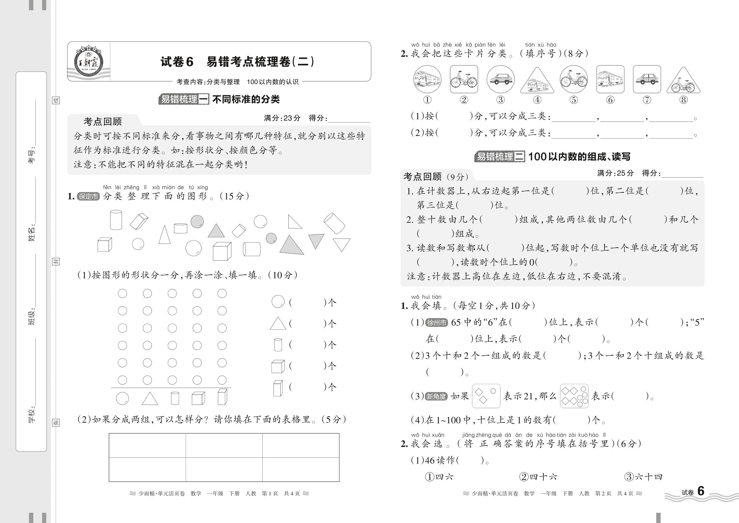 2024春下册一年级数学人教版 易错考点梳理卷(分类与整理 100以内数的认识)【6】