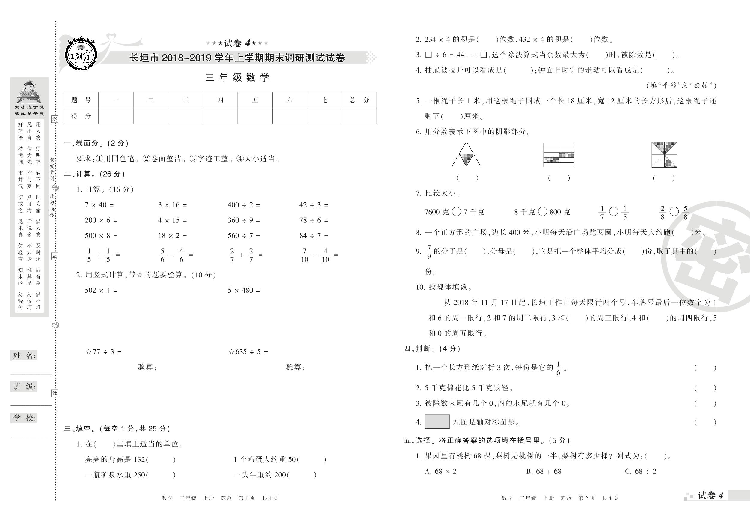 2018-2019学年第一学期长垣市三年级数学试卷(苏教版)【4】