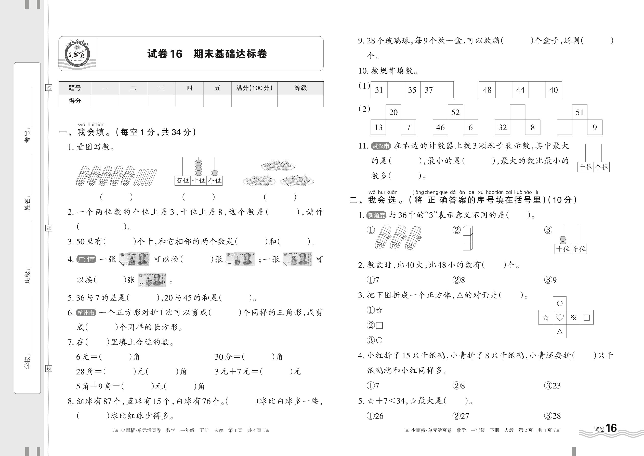 一年级数学人教版下册期末卷