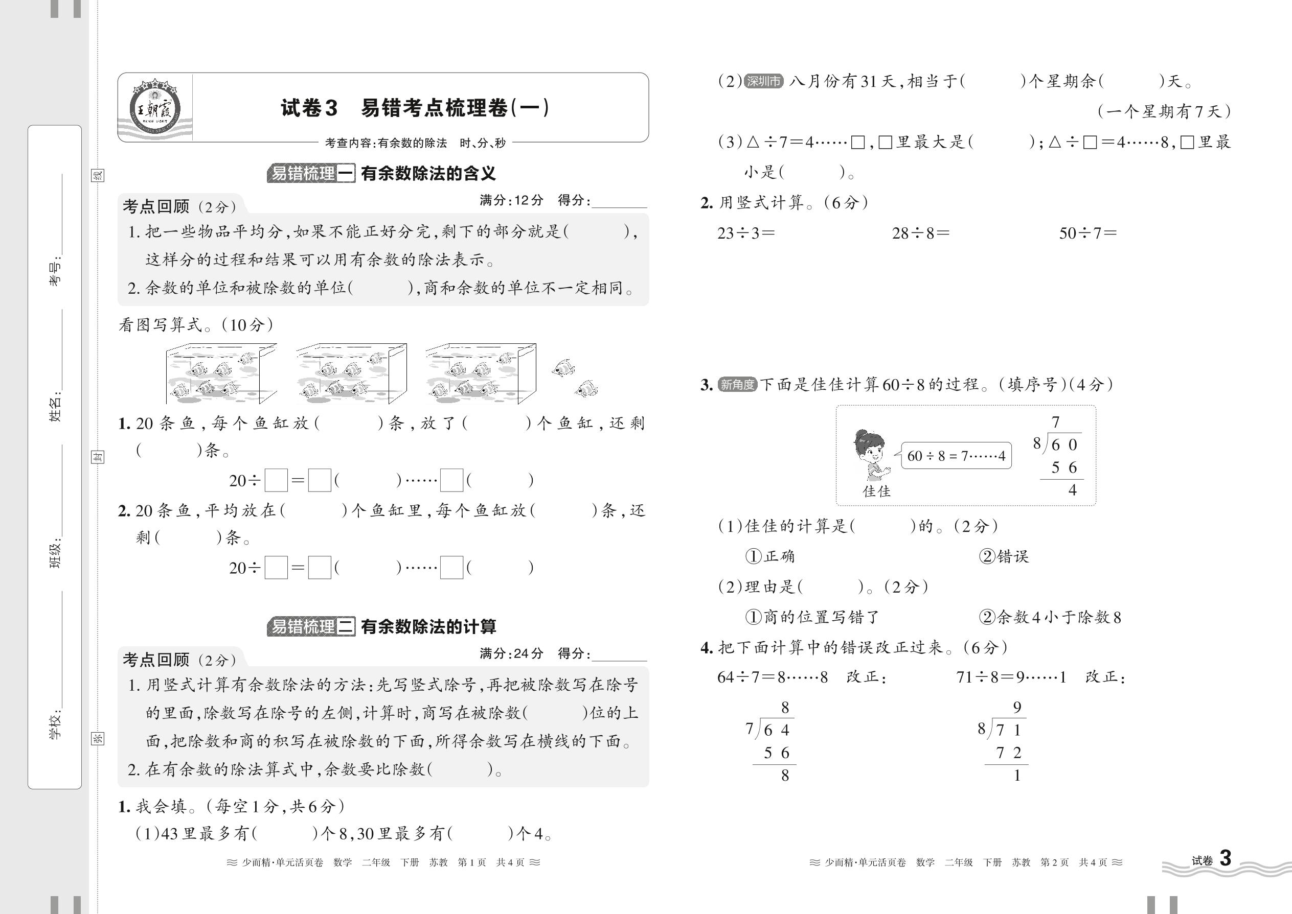 2024春下册二年级数学苏教版 易错考点梳理卷(有余数的除法 时、分、秒)【3】
