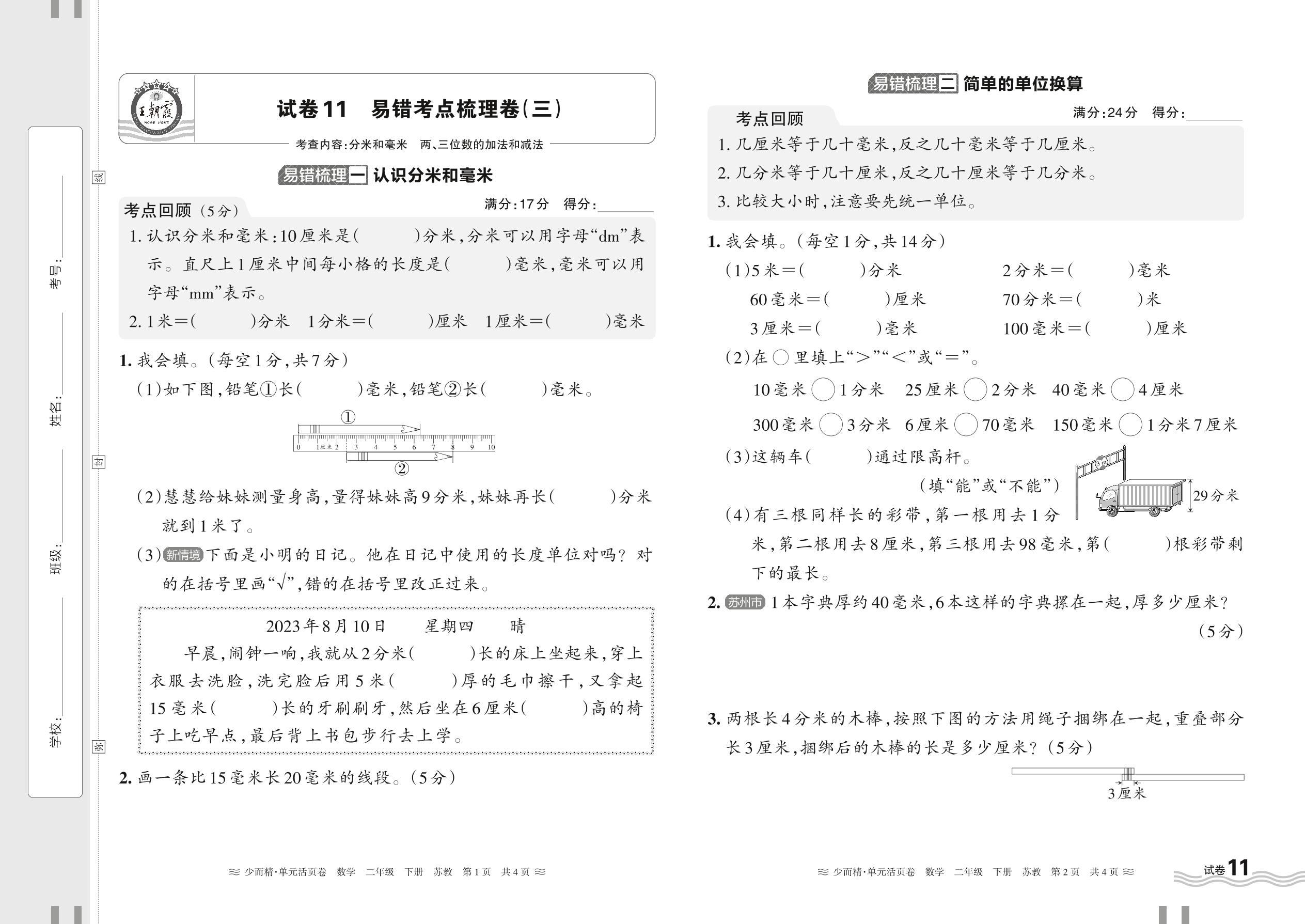 2024春下册二年级数学苏教版 易错考点梳理卷(分米和毫米 两、三位数的加法和减法)【11】
