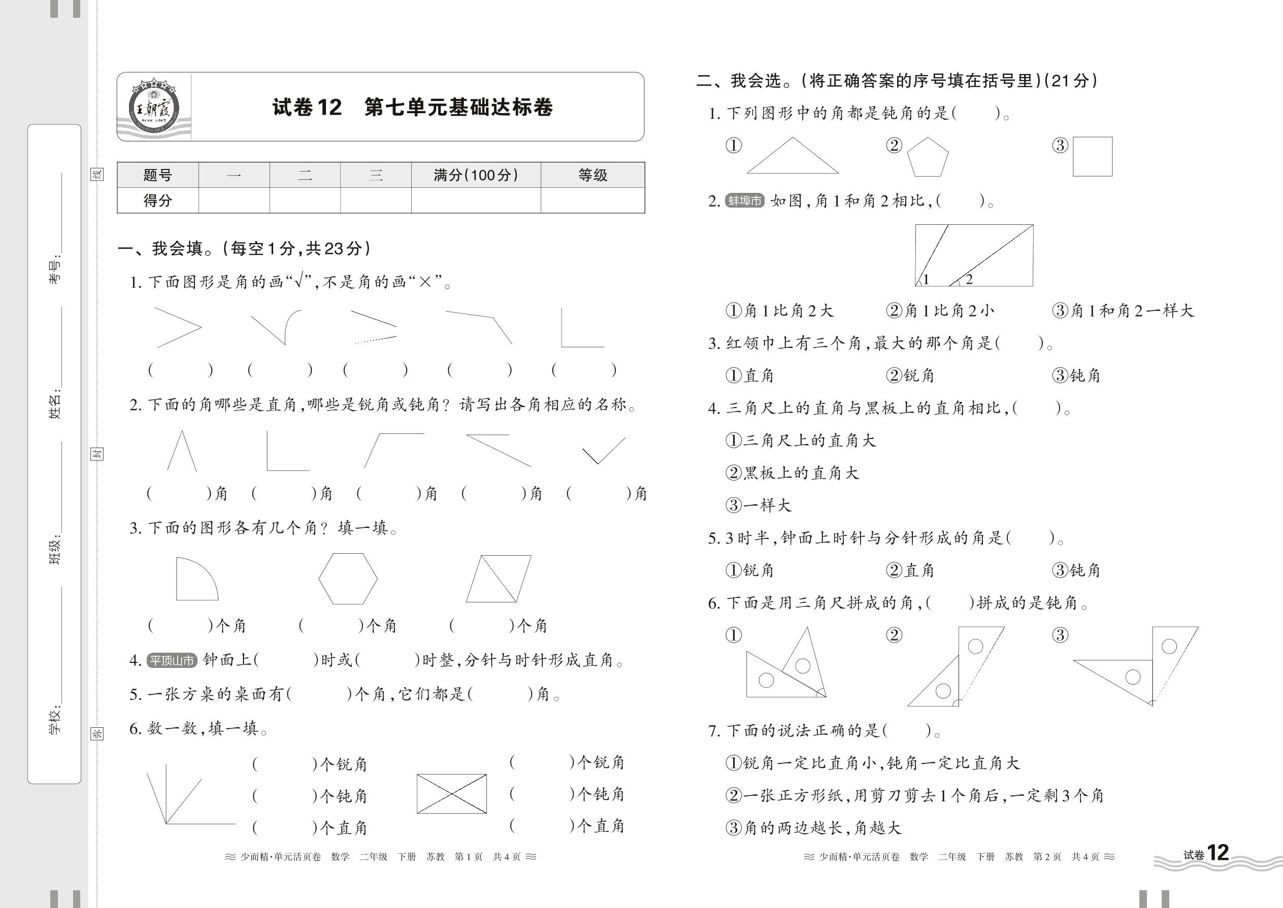 2024春下册二年级数学苏教版 第七单元基础达标卷【12】