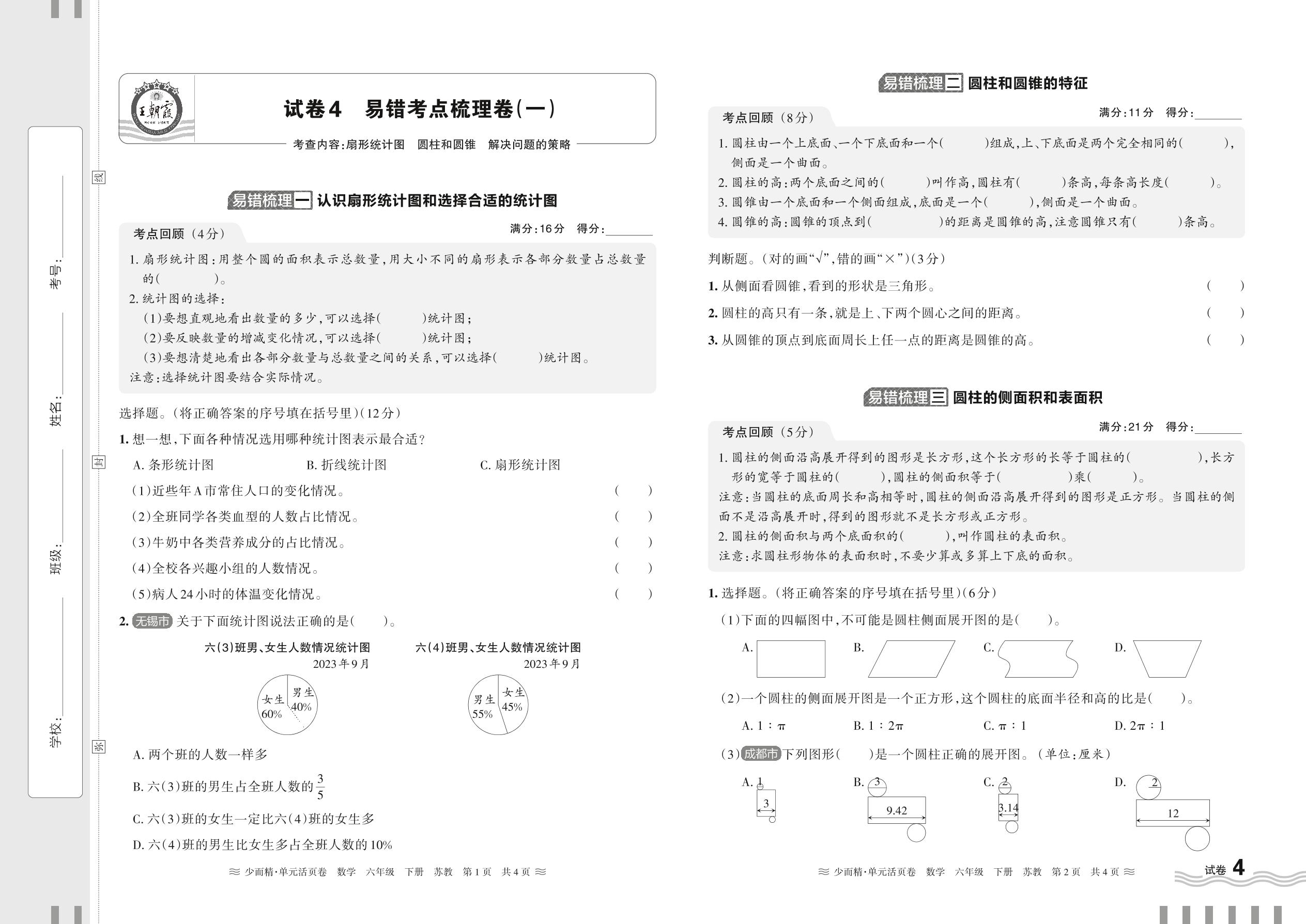 2024春下册六年级数学苏教版 易错考点梳理卷(扇形统计图 圆柱和圆锥 解决问题的策略)【4】
