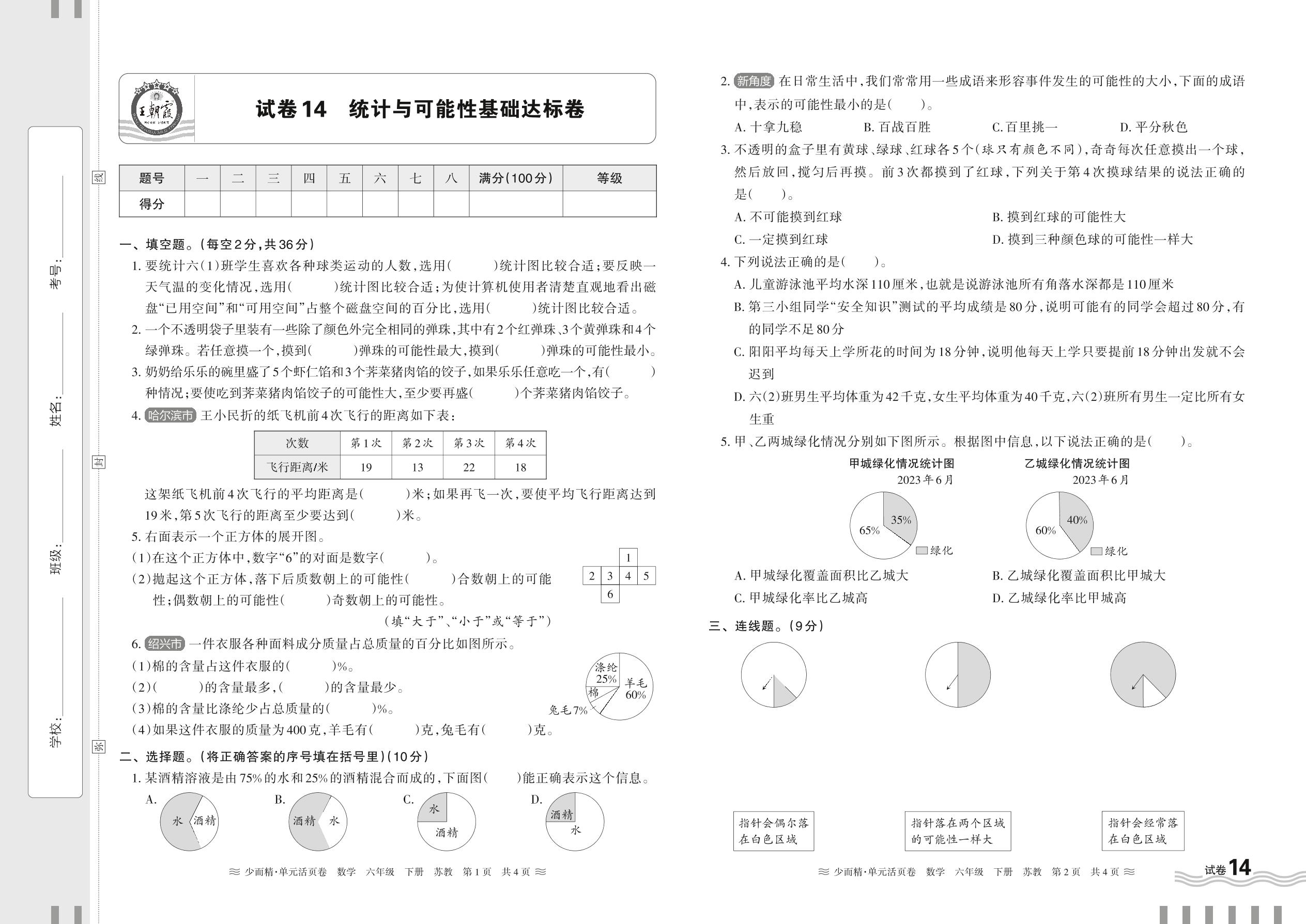 2024春下册六年级数学苏教版 统计与可能性基础达标卷【14】