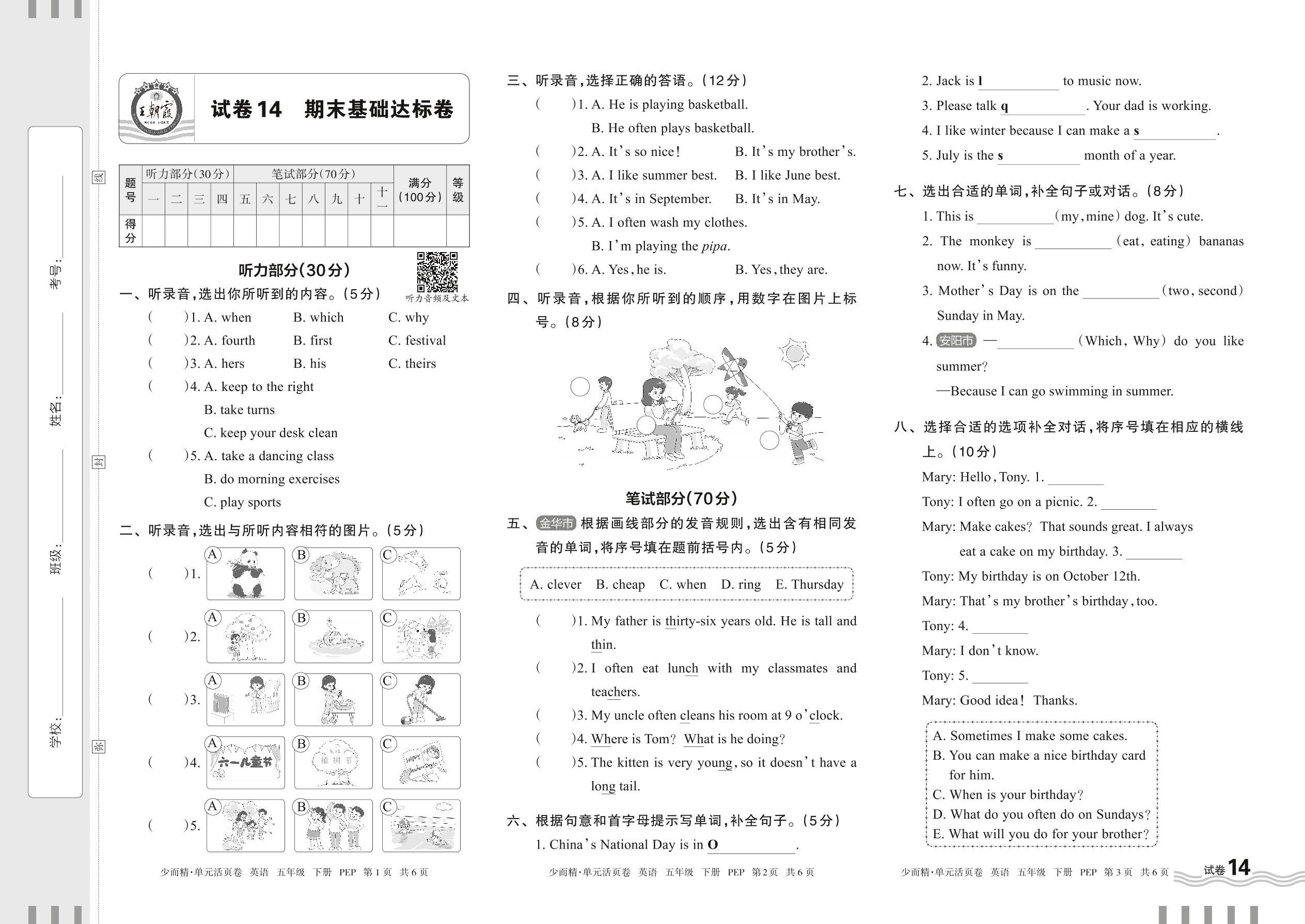 2024春下册五年级英语人教PEP版 期末基础达标卷【14】
