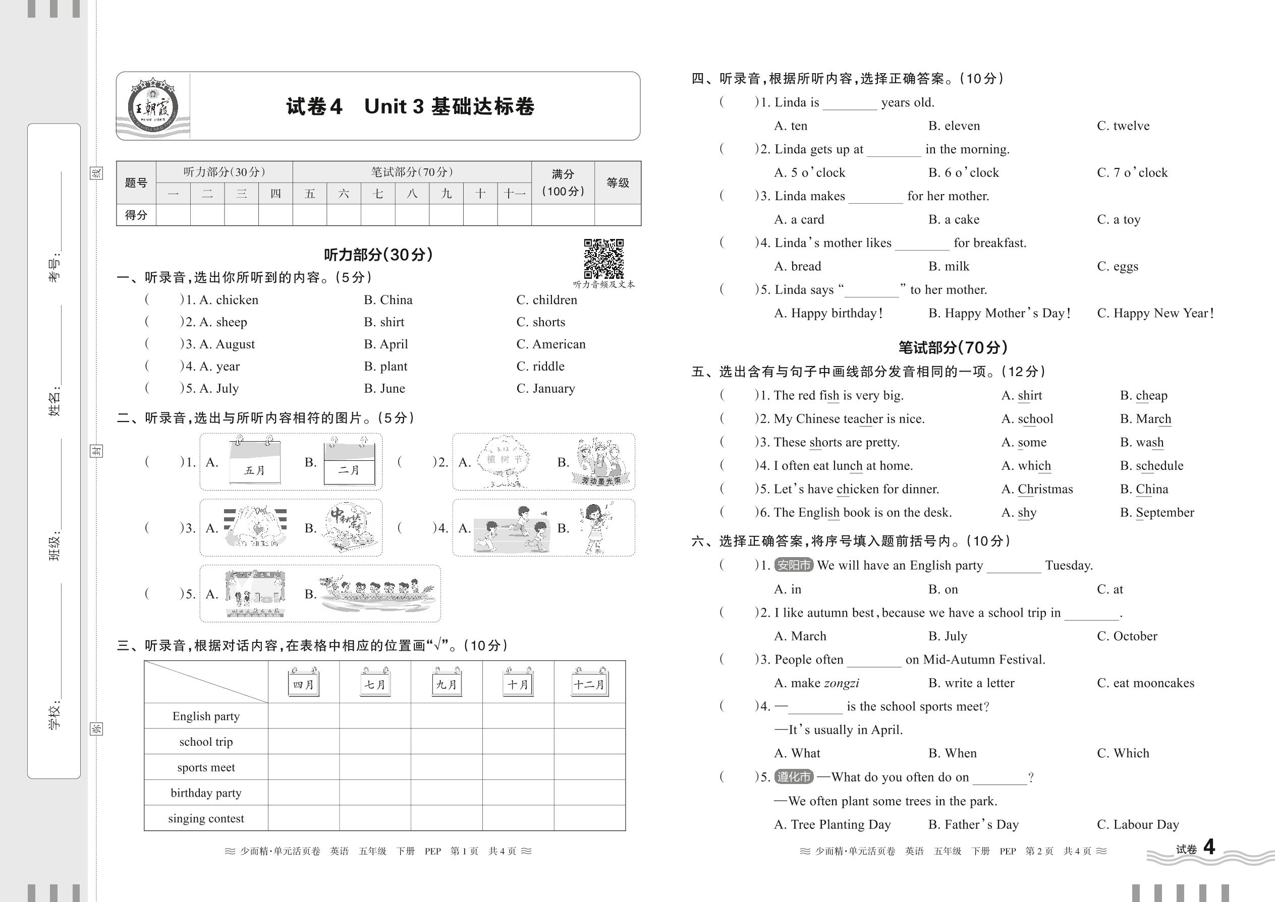 2024春下册五年级英语人教PEP版 Unit 3 基础达标卷【4】