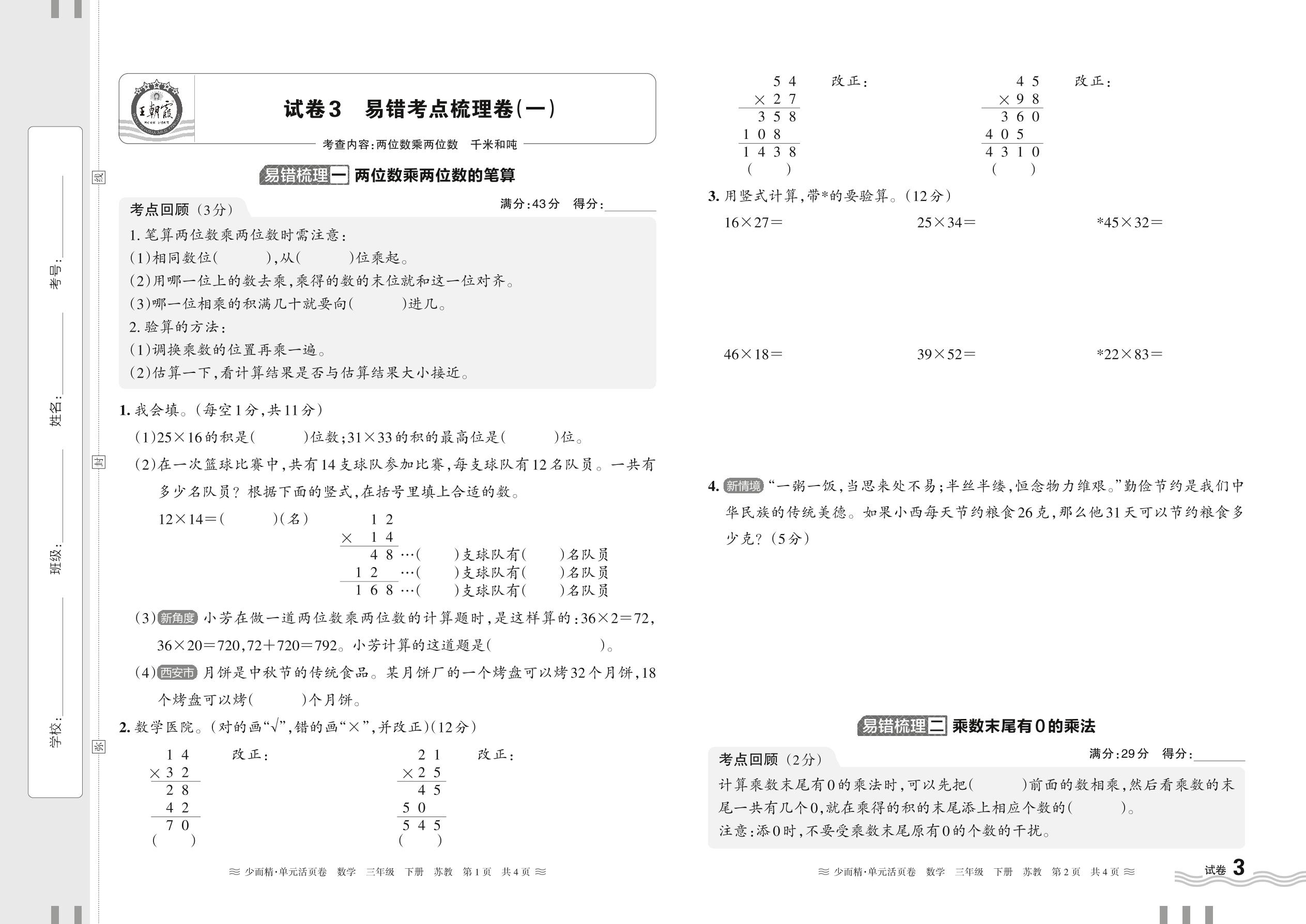 2024春下册三年级数学苏教版 易错考点梳理卷(两位数乘两位数 千米和吨)【3】