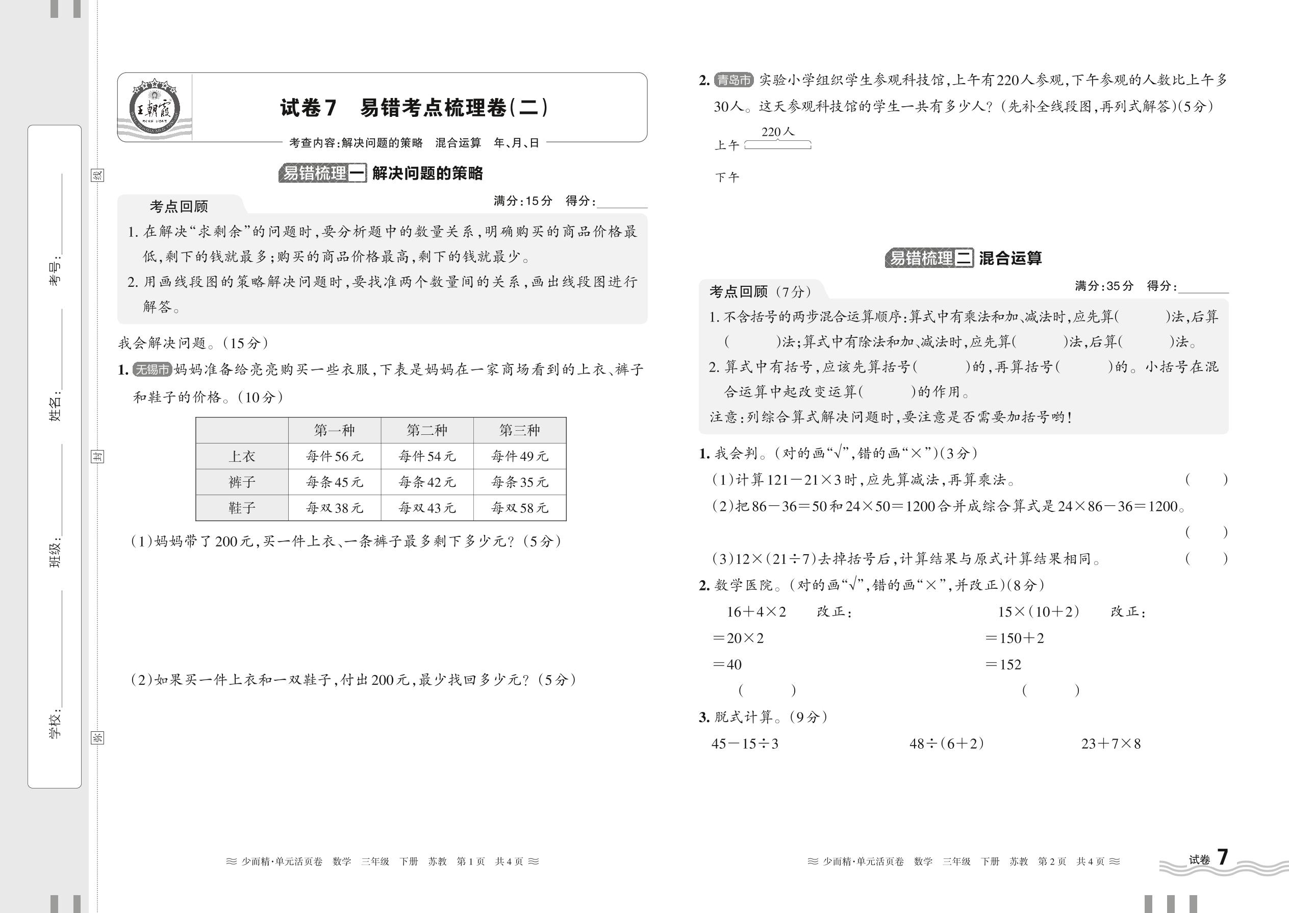 2024春下册三年级数学苏教版 易错考点梳理卷(解决问题的策略 混合运算 年、月、日)【7】