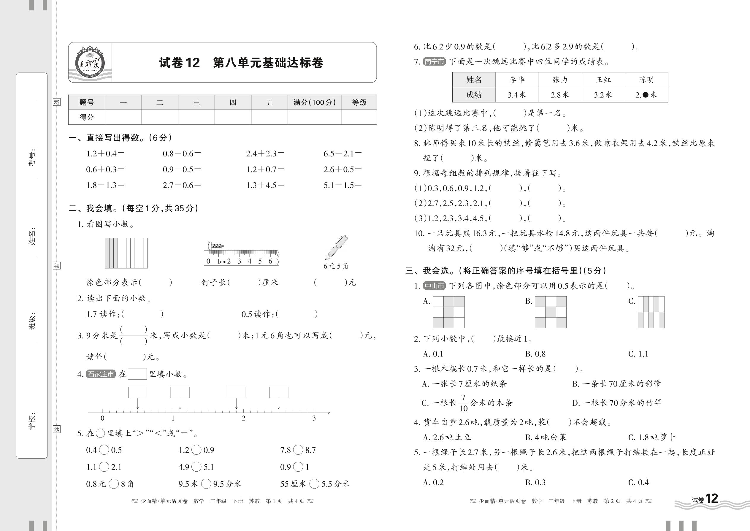 2024春下册三年级数学苏教版 第八单元基础达标卷【12】