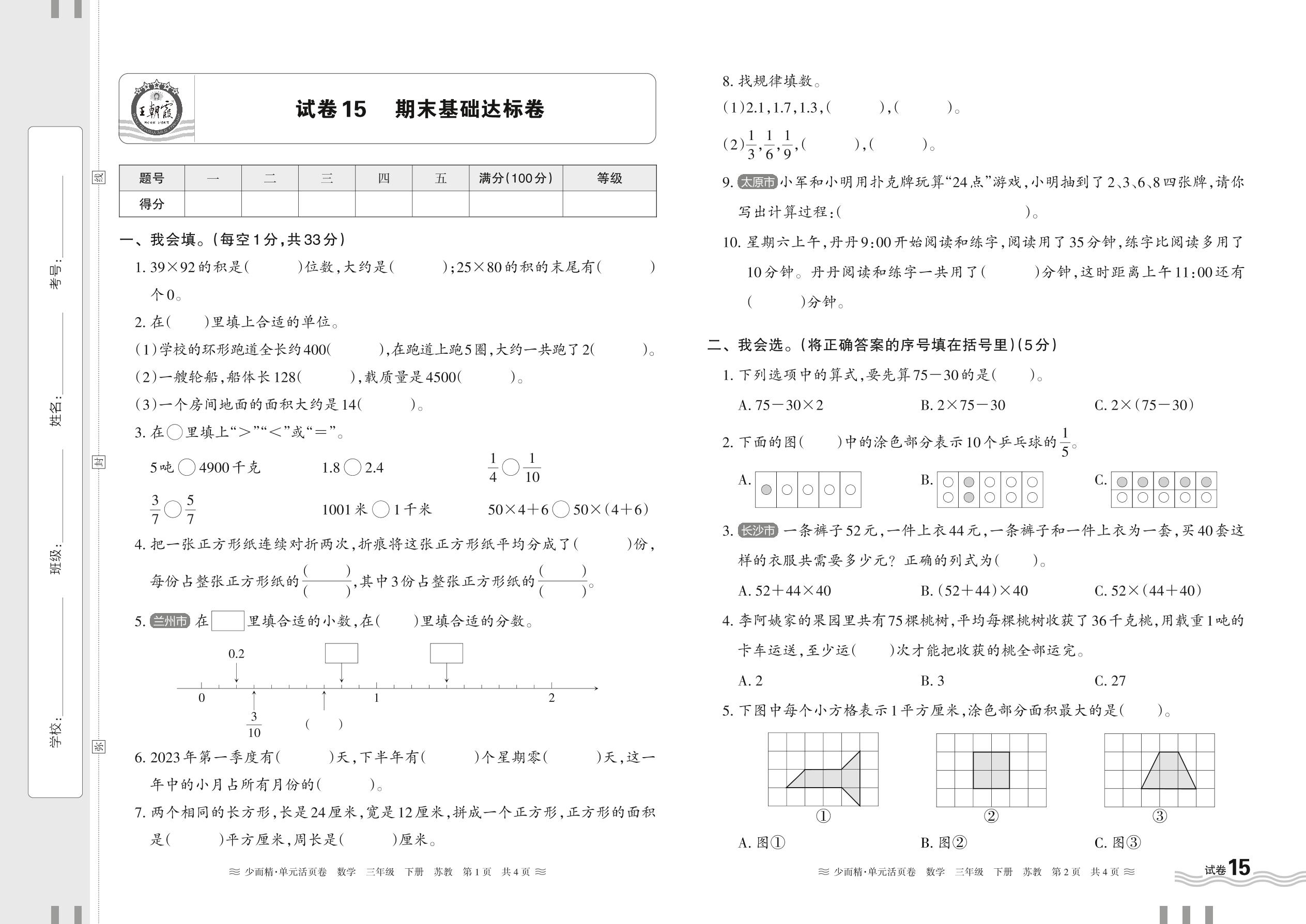 2024春下册三年级数学苏教版 期末基础达标卷【15】