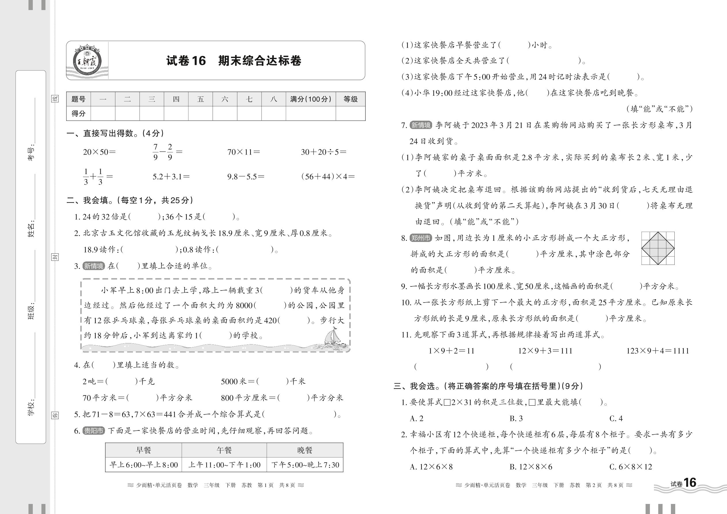 2024春下册三年级数学苏教版 期末综合达标卷【16】