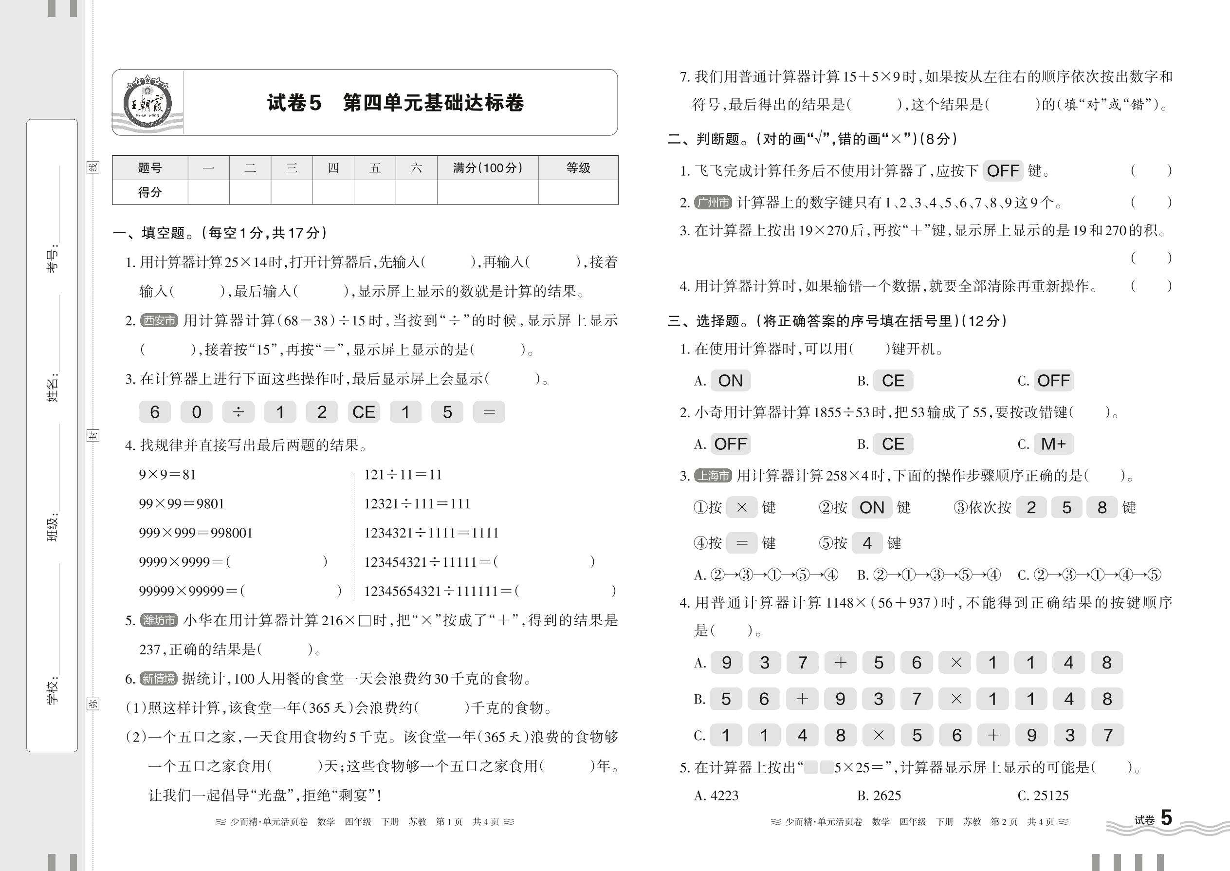 四年级数学苏教版下册单元卷