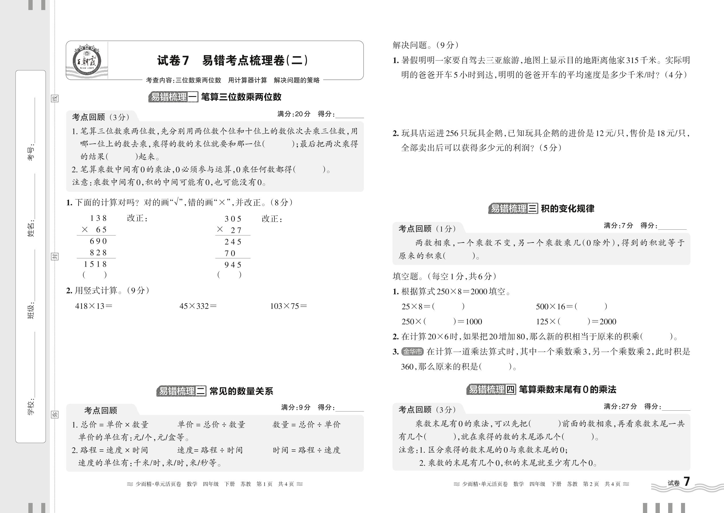 2024春下册四年级数学苏教版 易错考点梳理卷(三位数乘两位数 用计算器计算 解决问题的策略)【7】