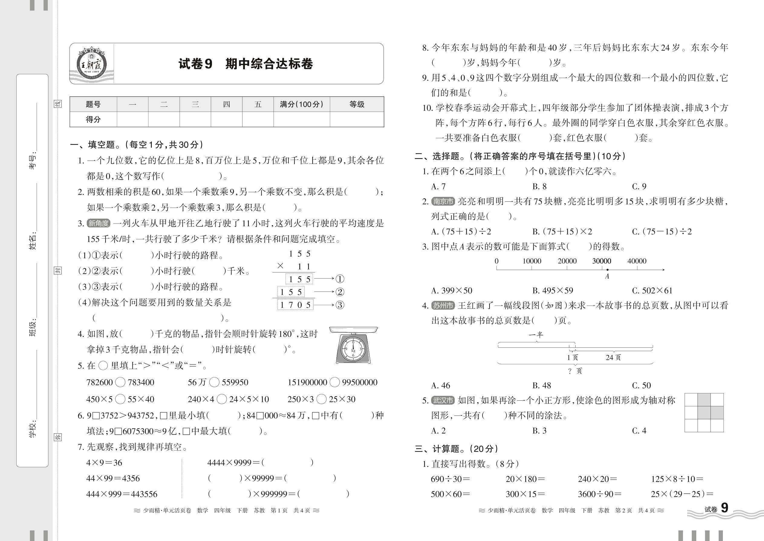 2024春下册四年级数学苏教版 期中综合达标卷【9】