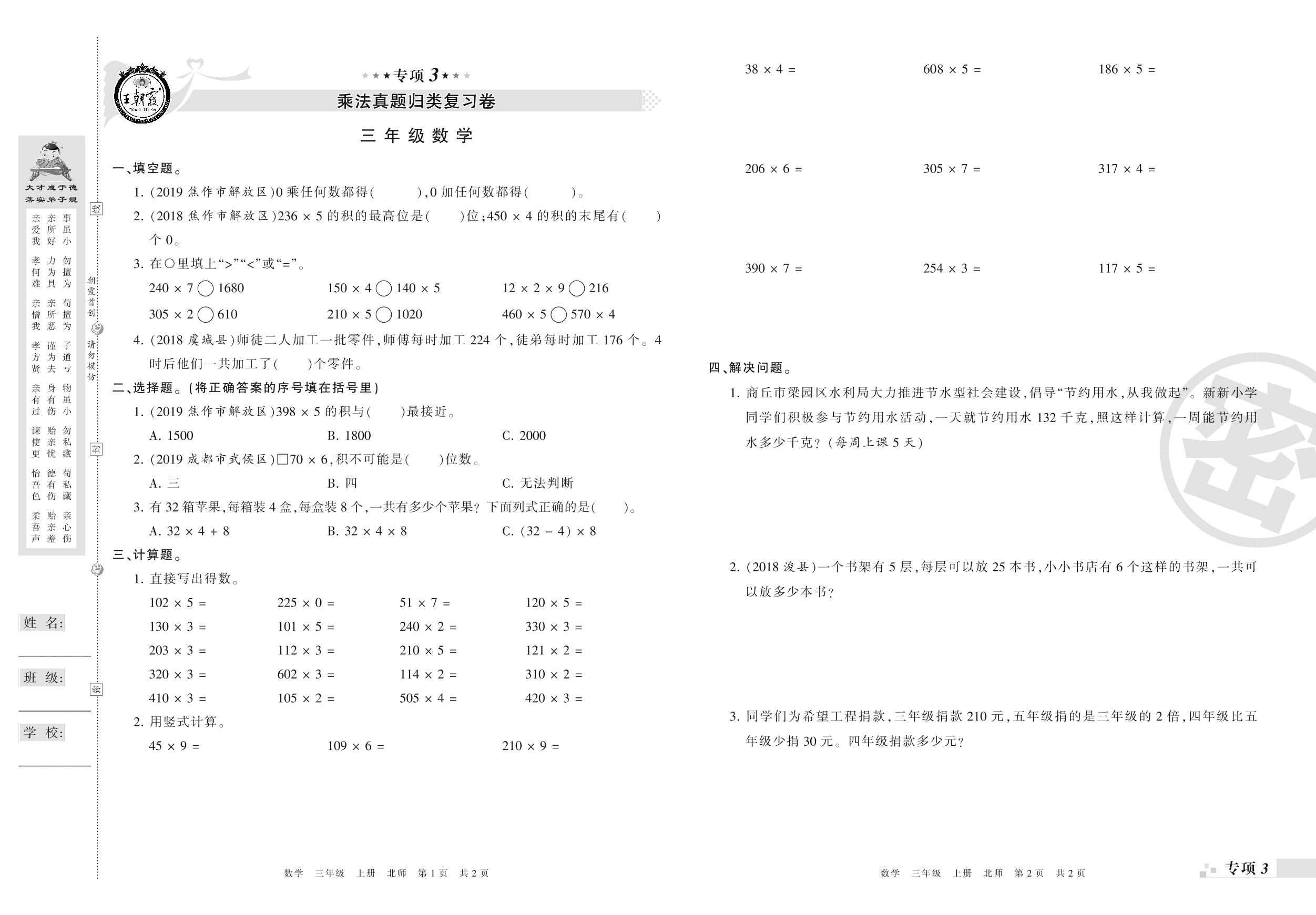王朝霞期末专项卷——乘法、混合运算真题归类复习三年级上册数学(北师版)_R21080495121【0】