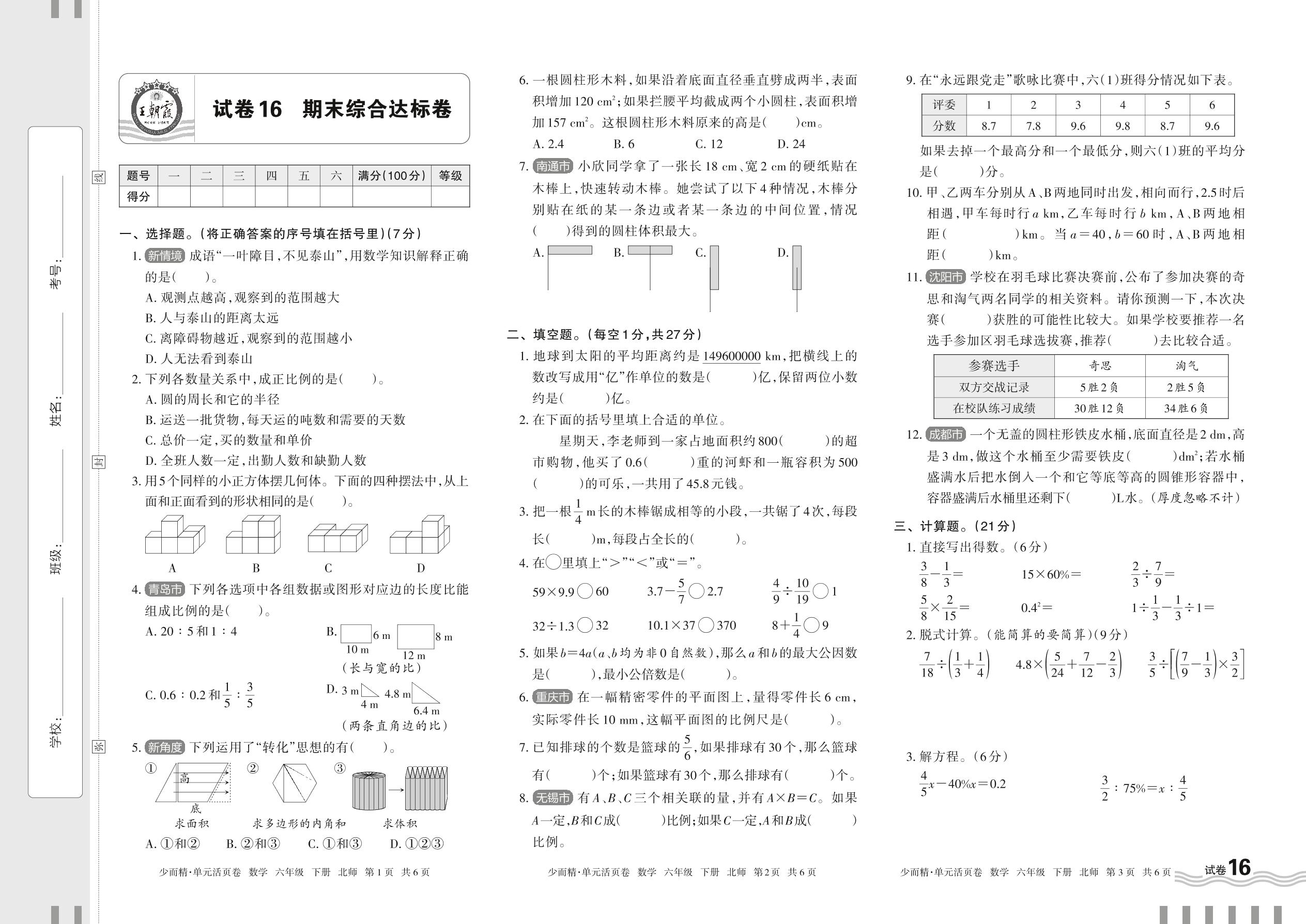 2024春下册六年级数学北师版 期末综合达标卷【16】