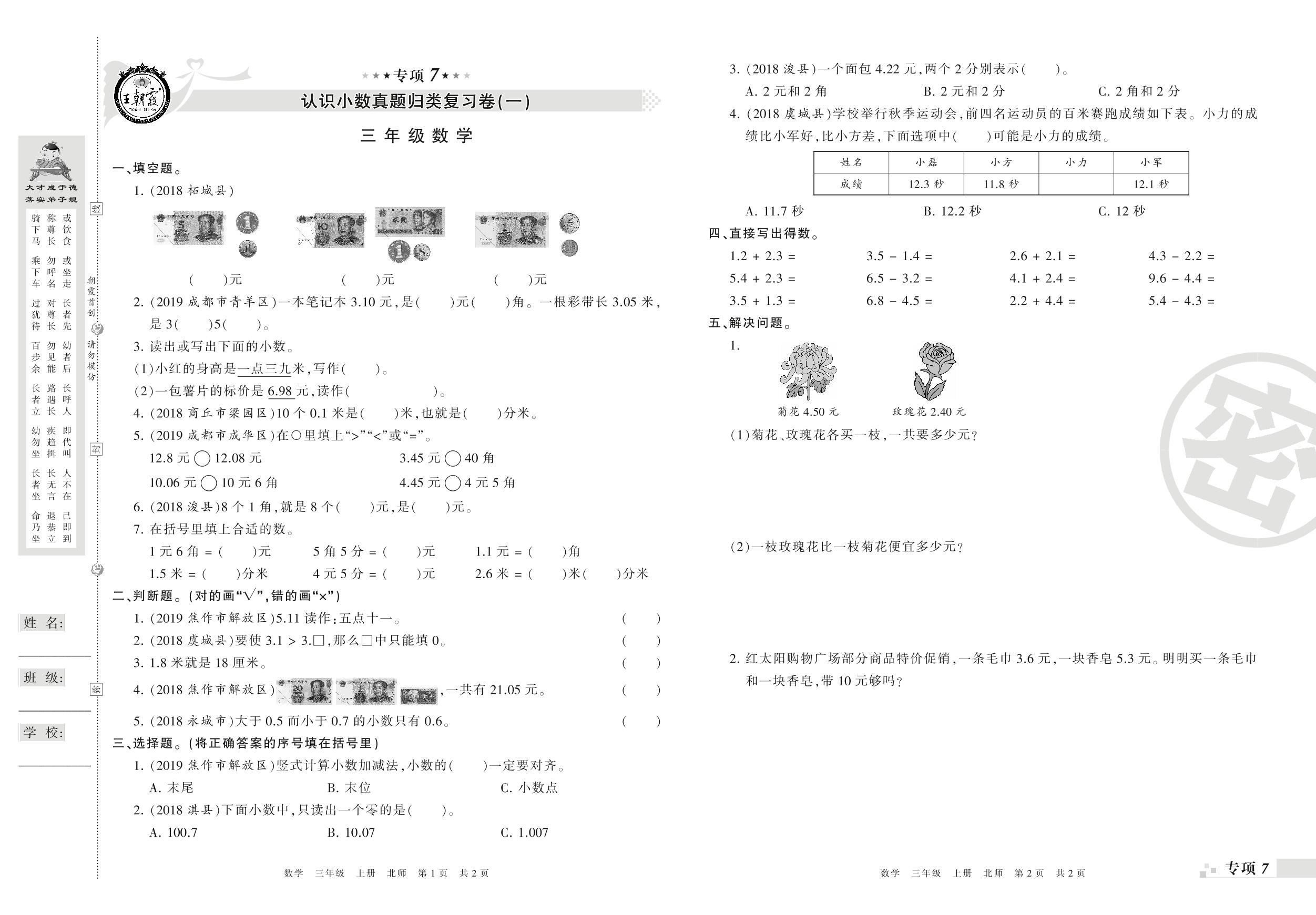 王朝霞期末专项卷——认识小数真题归类复习三年级上册数学(北师版)_R21080495128【0】