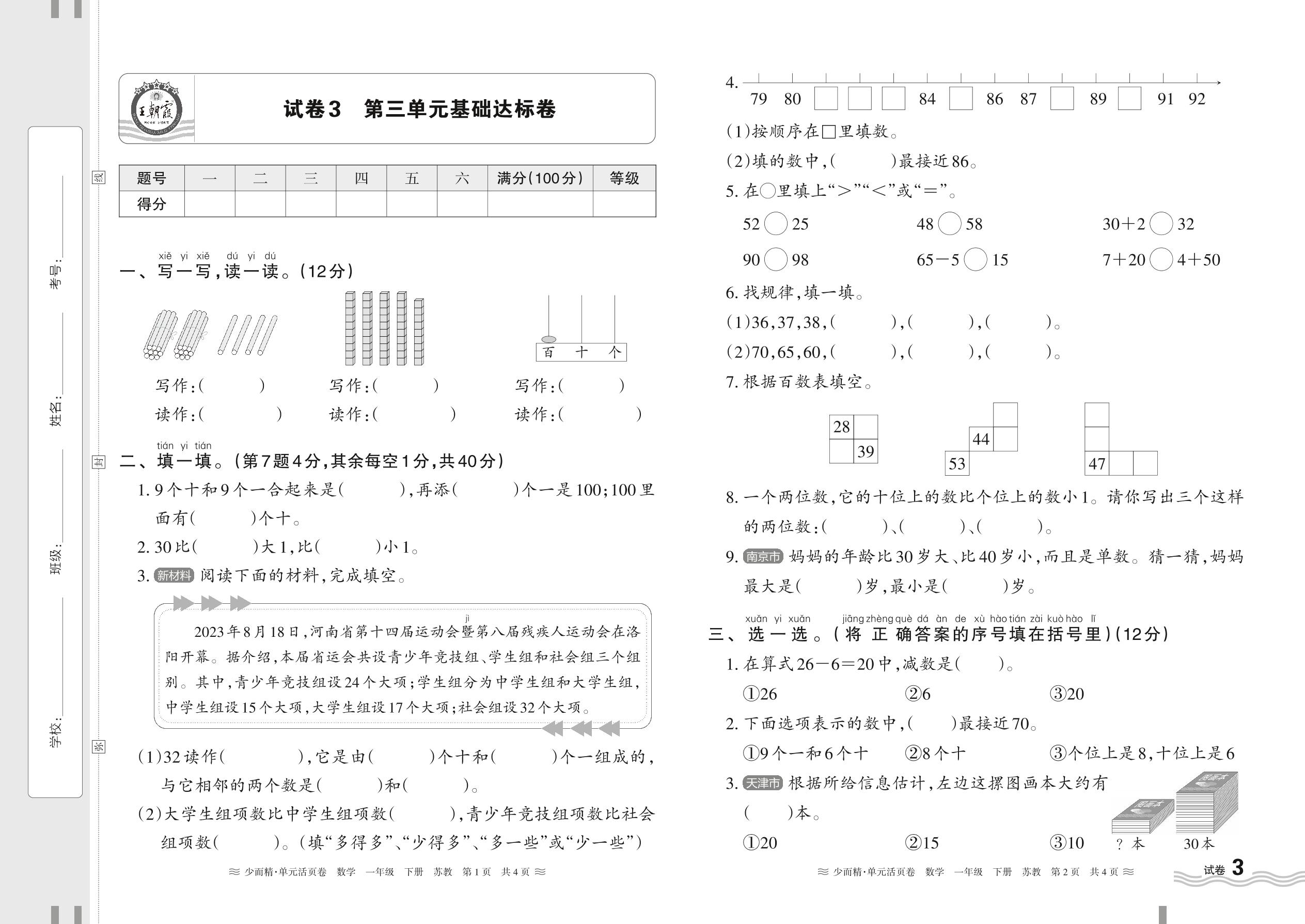 2024春下册一年级数学苏教版 第三单元基础达标卷【3】