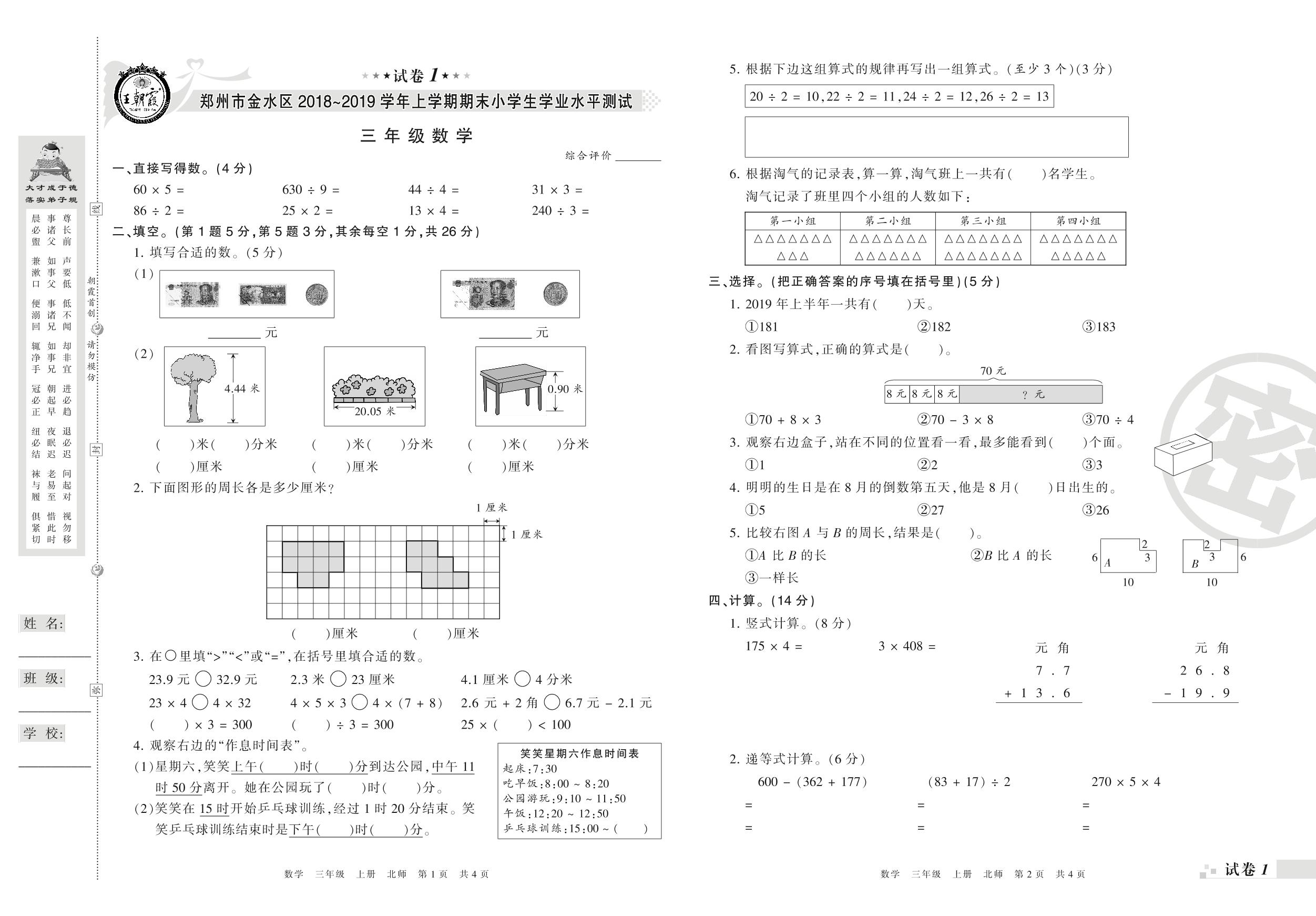 2018-2019学年第一学期郑州市金水区三年级数学试卷(北师版)_R21080495132【1】