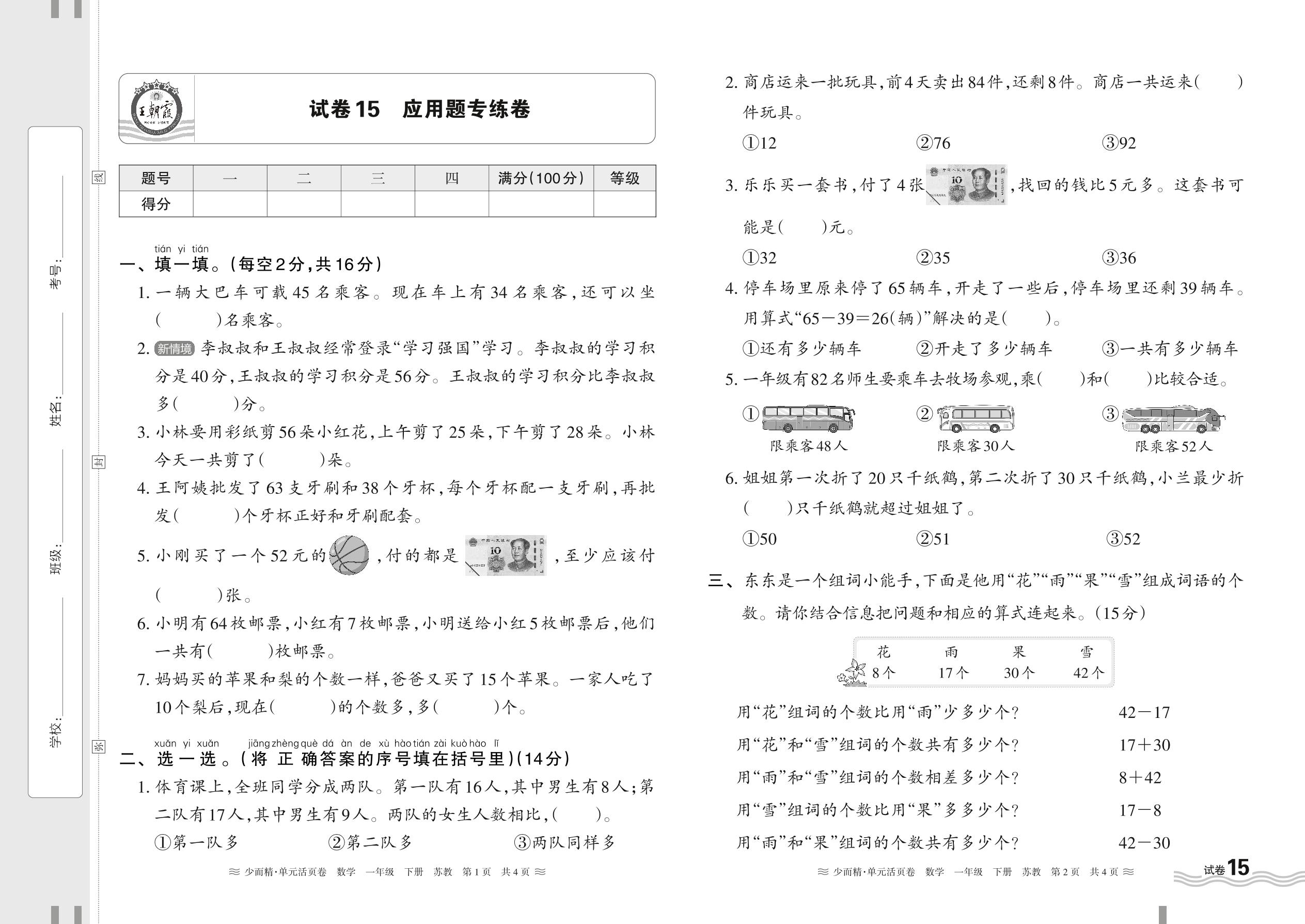 2024春下册一年级数学苏教版 应用题专练卷【15】