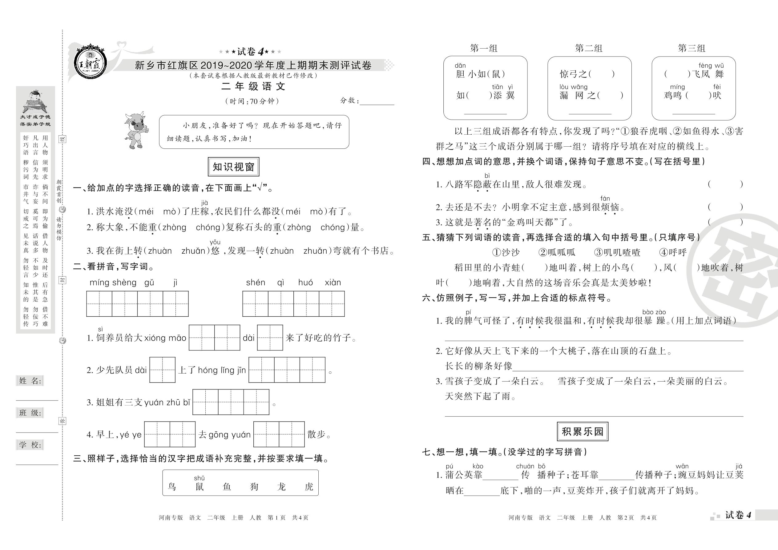 2019-2020学年第一学期新乡市红旗区二年级语文试卷(人教版)【4】