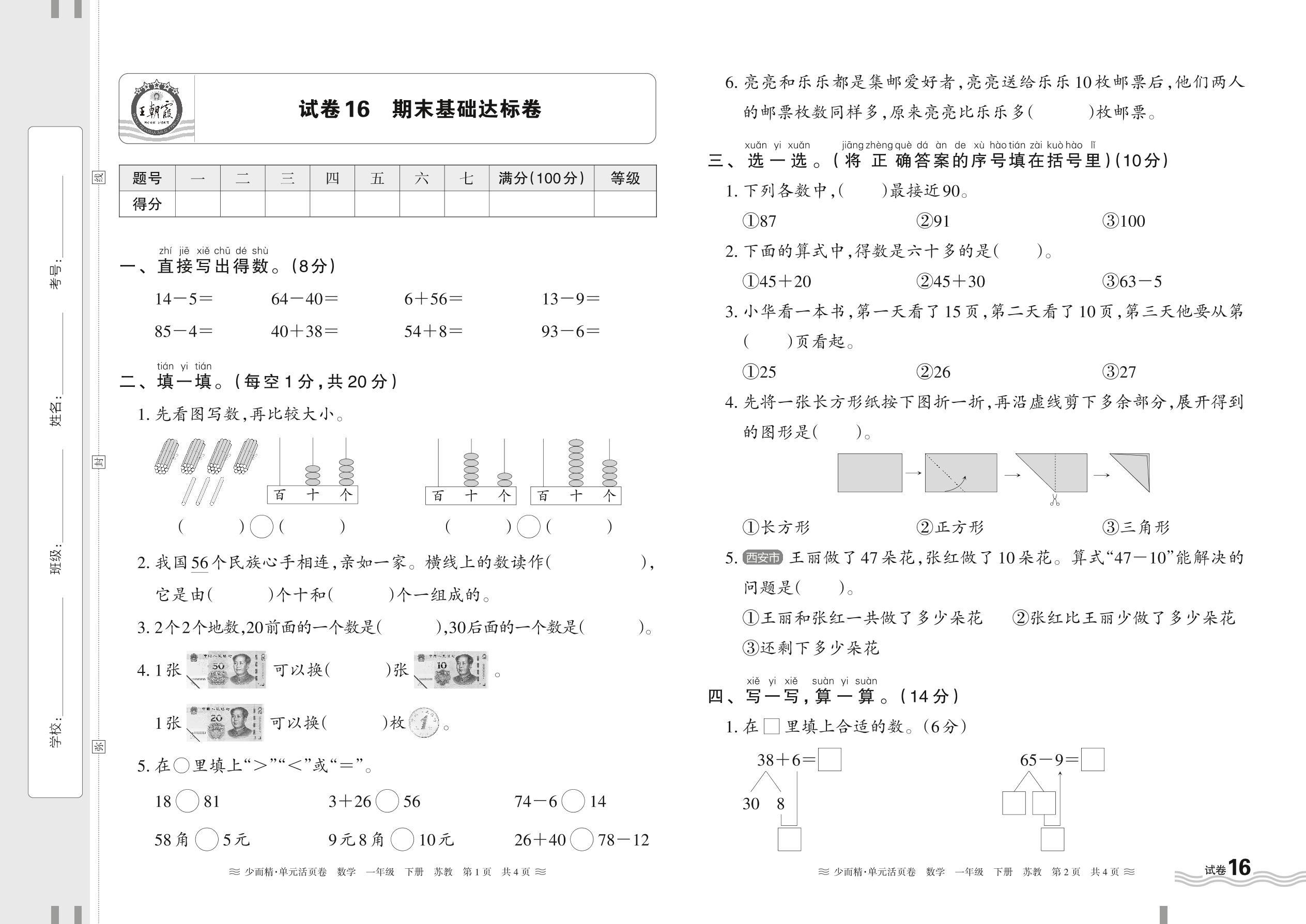 2024春下册一年级数学苏教版 期末基础达标卷【16】