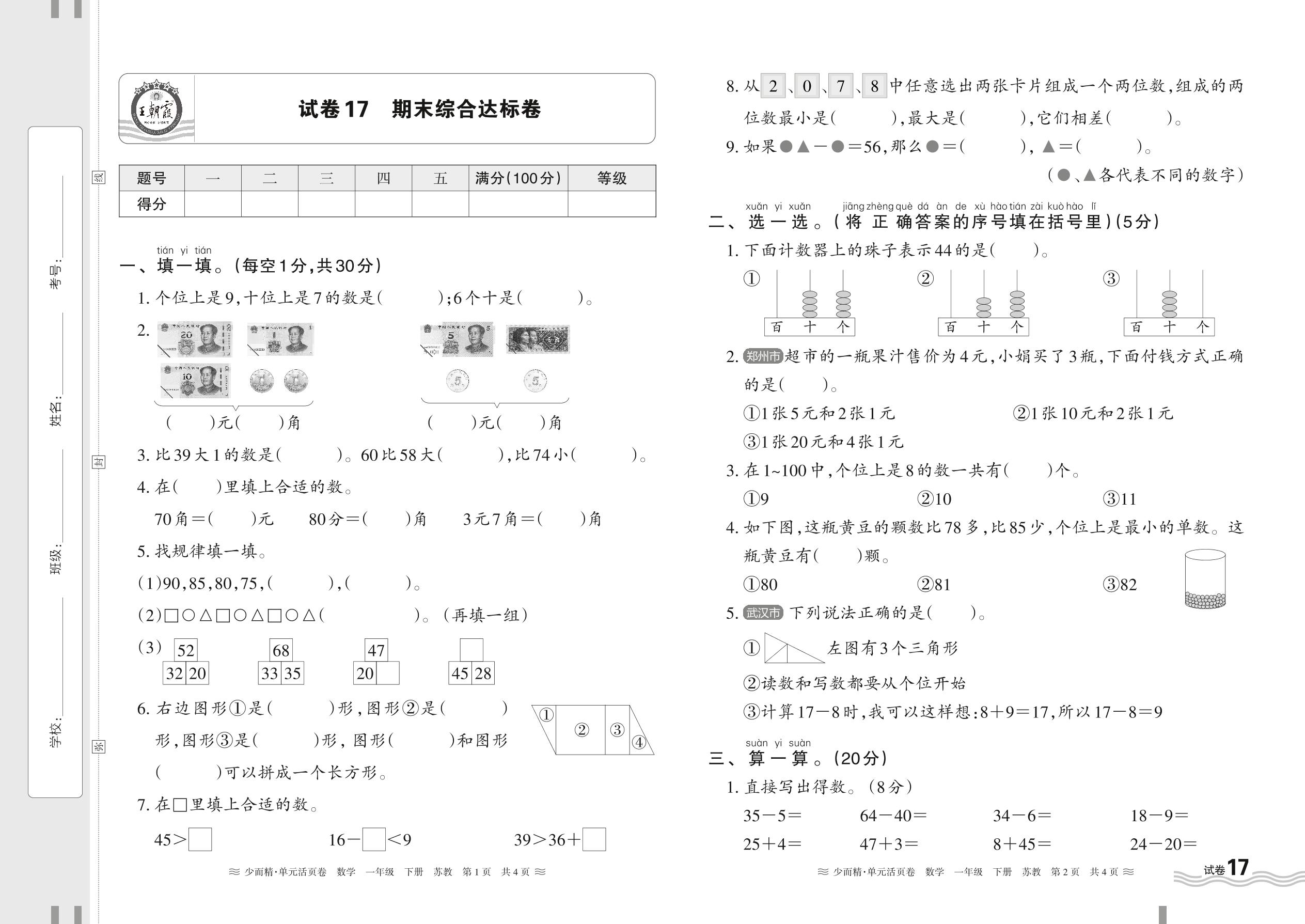 2024春下册一年级数学苏教版 期末综合达标卷【17】