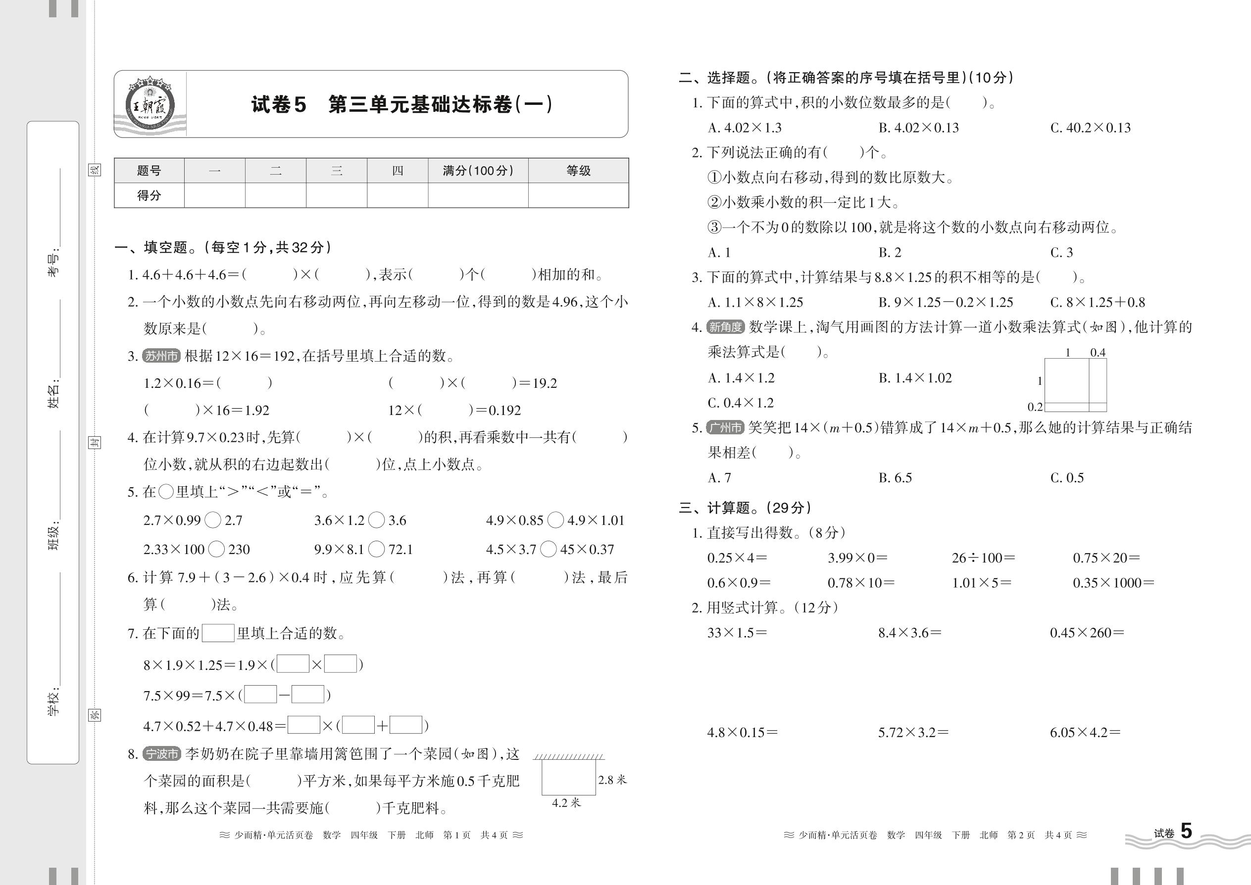 2024春下册四年级数学北师版 第三单元基础达标卷(一)【5】