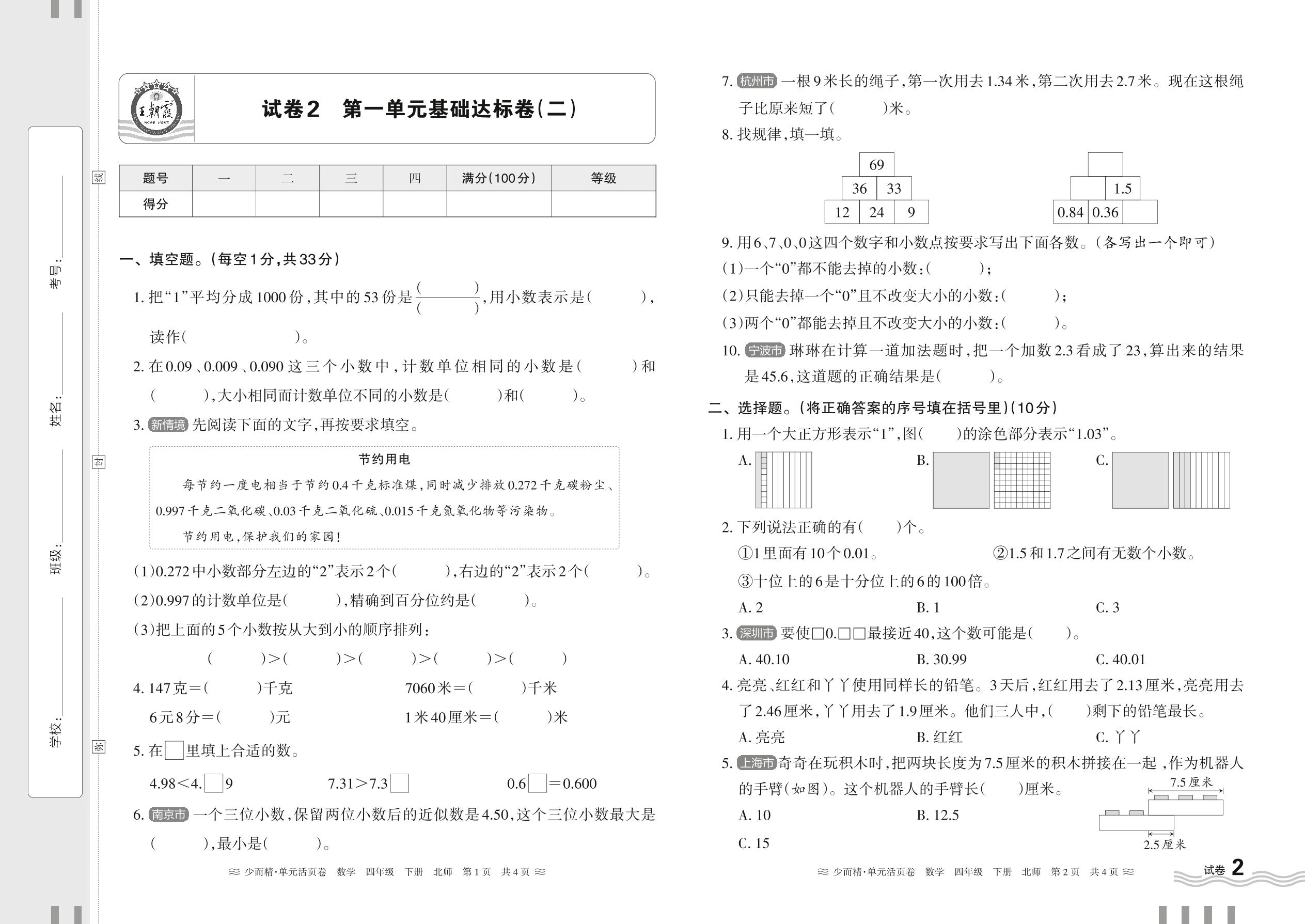 2024春下册四年级数学北师版 第一单元基础达标卷(二)【2】