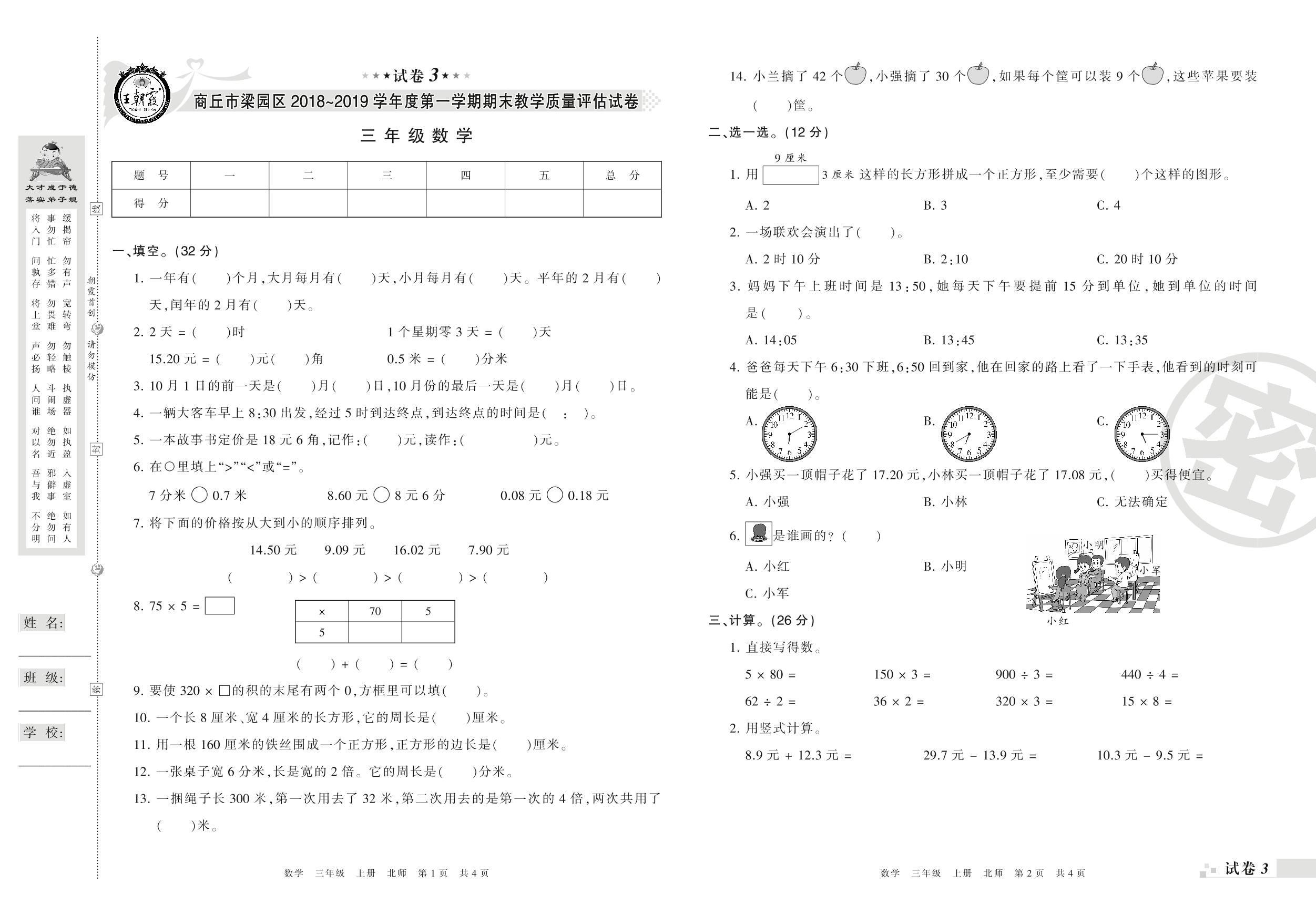 2018-2019学年第一学期商丘市梁园区三年级数学试卷(北师版)【3】
