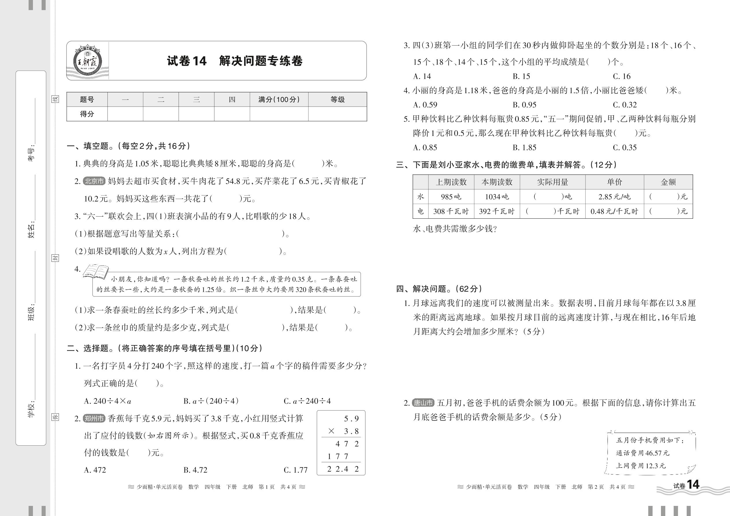 2024春下册四年级数学北师版 解决问题专练卷【14】