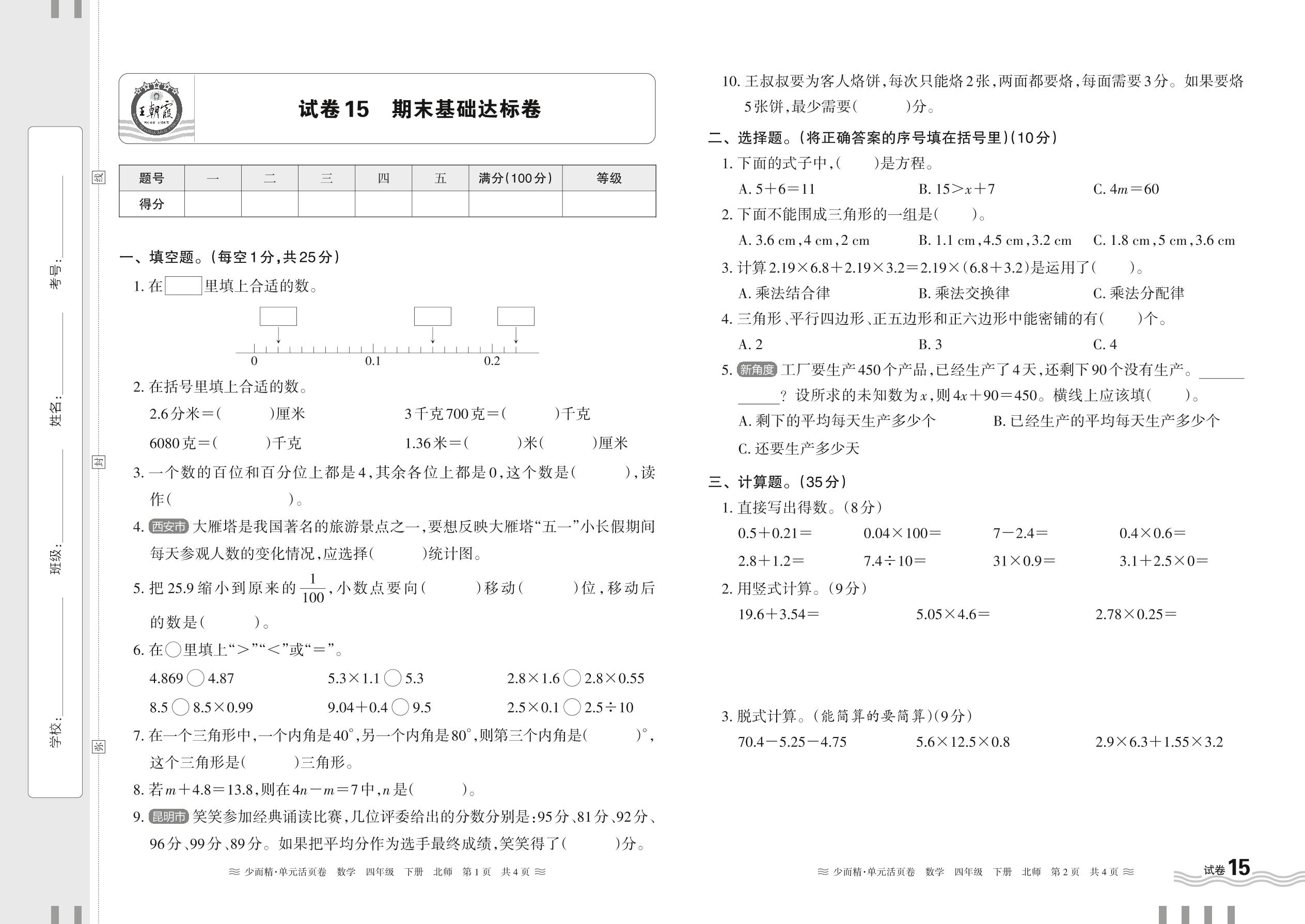 2024春下册四年级数学北师版 期末基础达标卷【15】