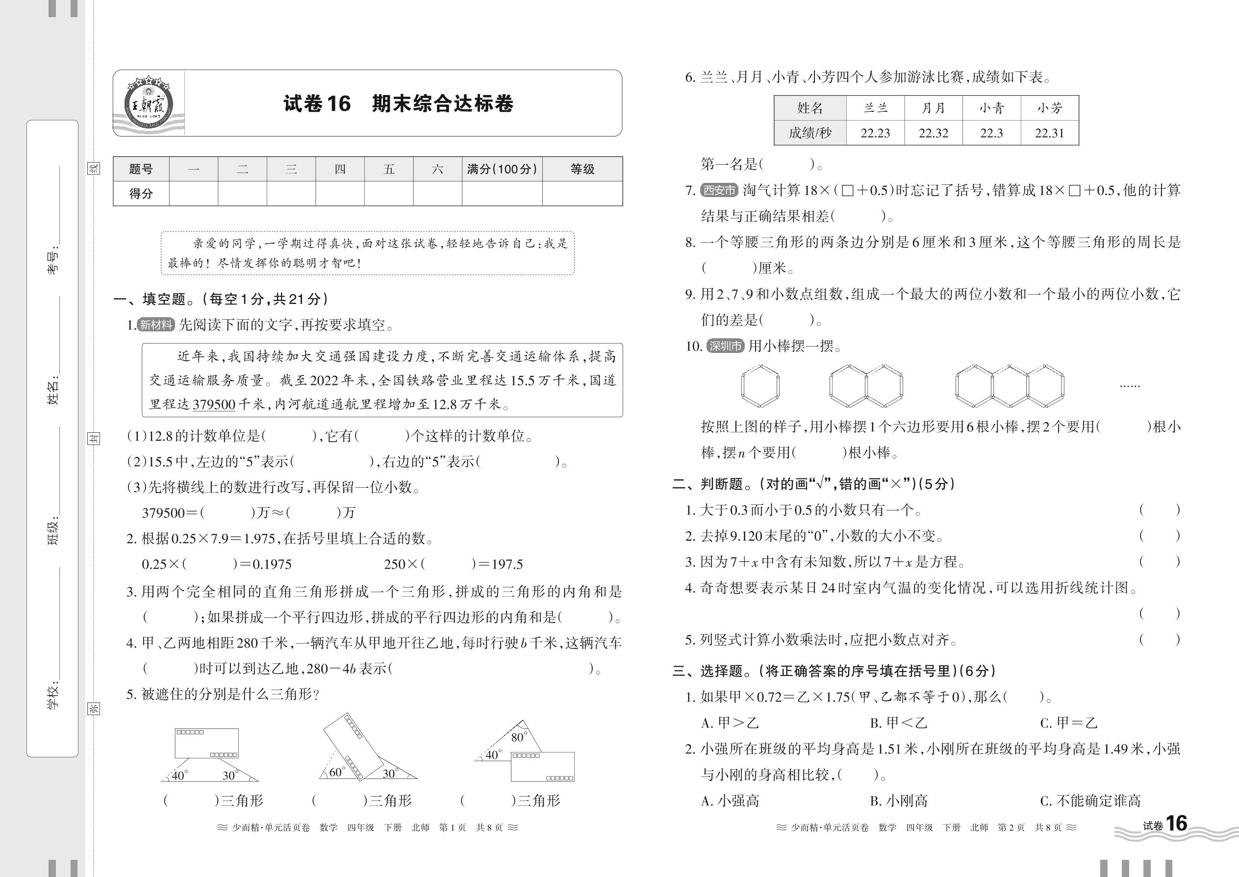 2024春下册四年级数学北师版 期末综合达标卷【16】
