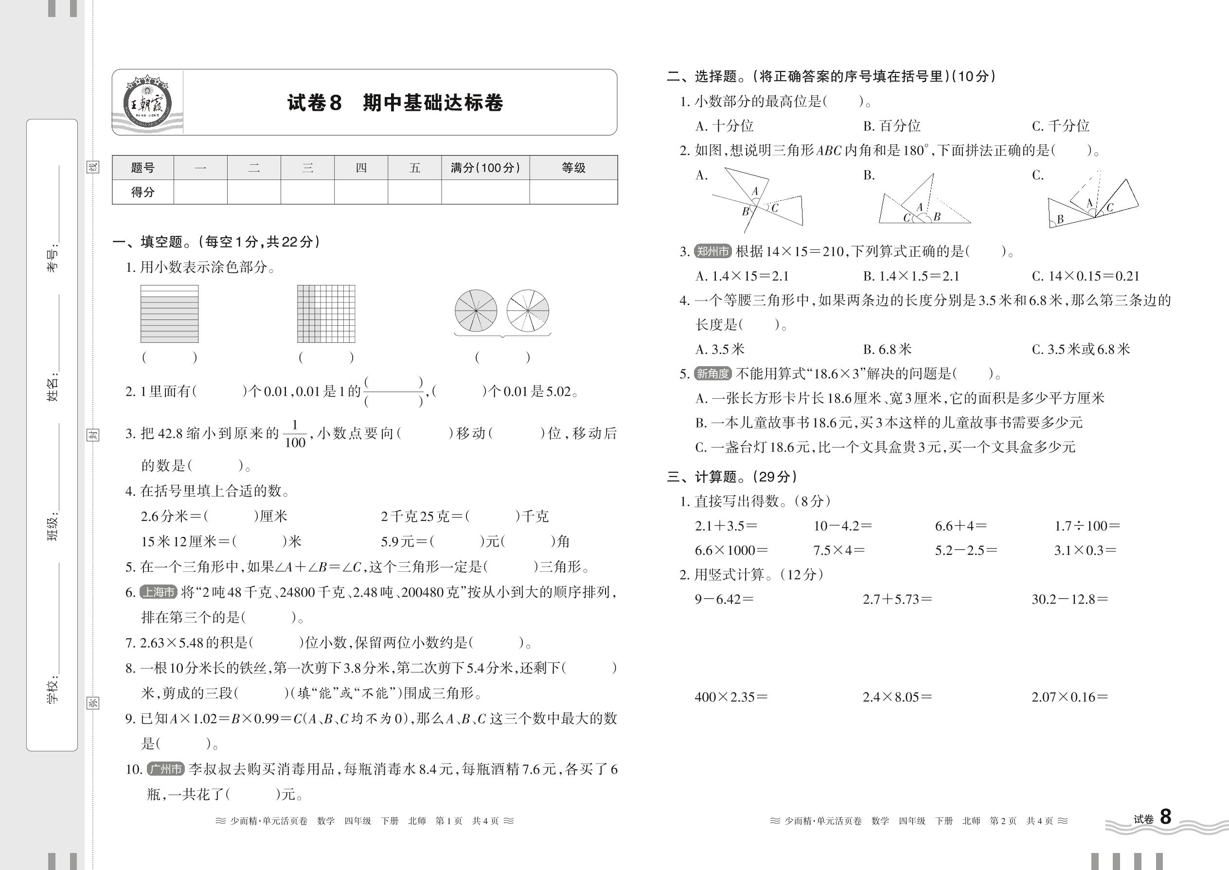 2024春下册四年级数学北师版 期中基础达标卷【8】