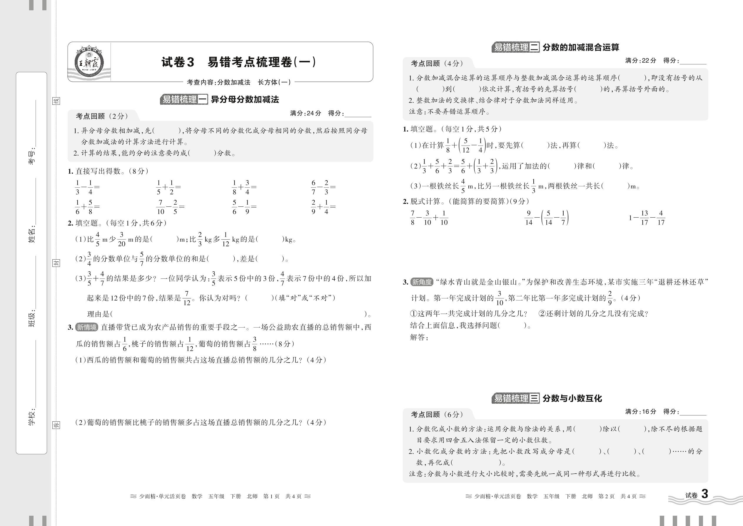 2024春下册五年级数学北师版 易错考点梳理卷——分数加减法 长方体(一)【3】