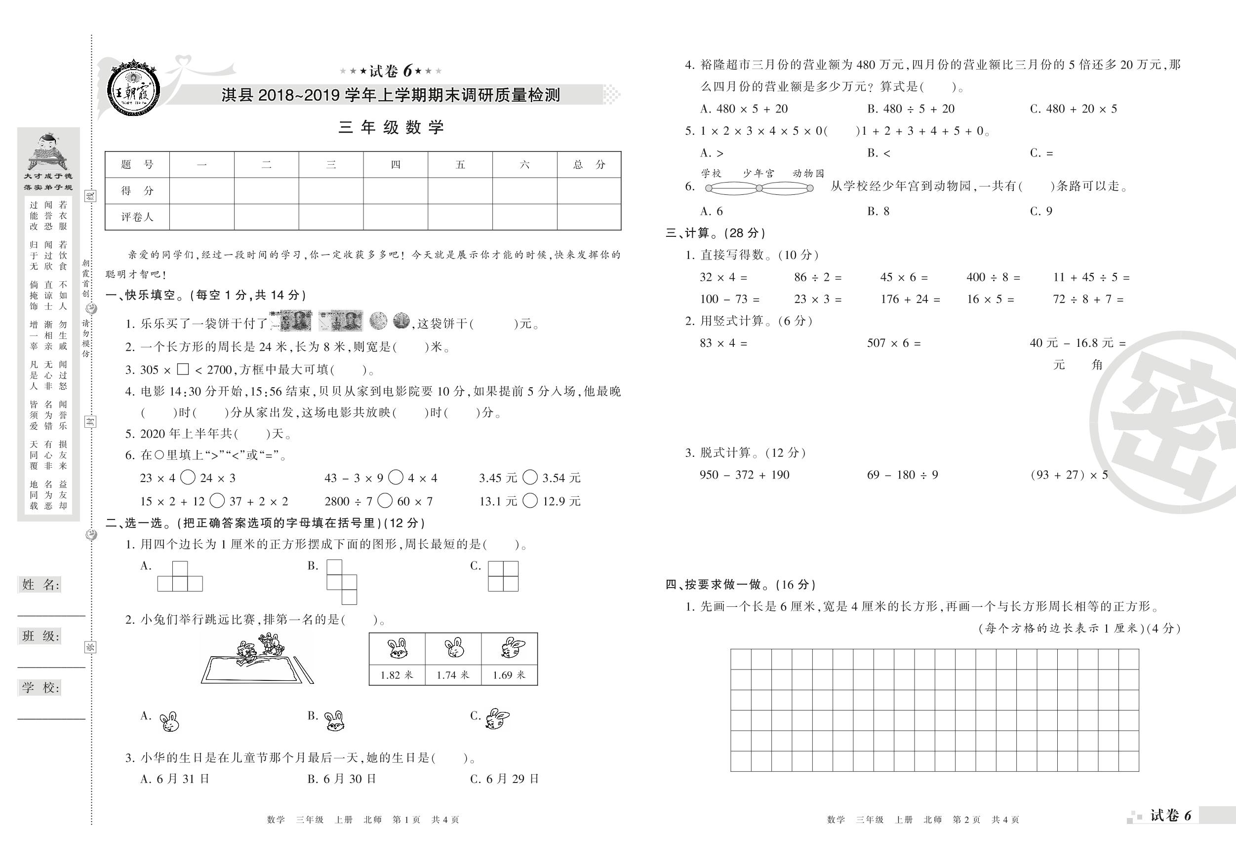 2018-2019学年第一学期鹤壁市淇县三年级数学试卷(北师版)【6】