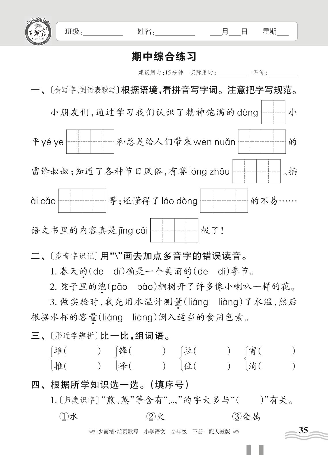 2024春下册二年级语文人教版 期中综合练习(默写专练)