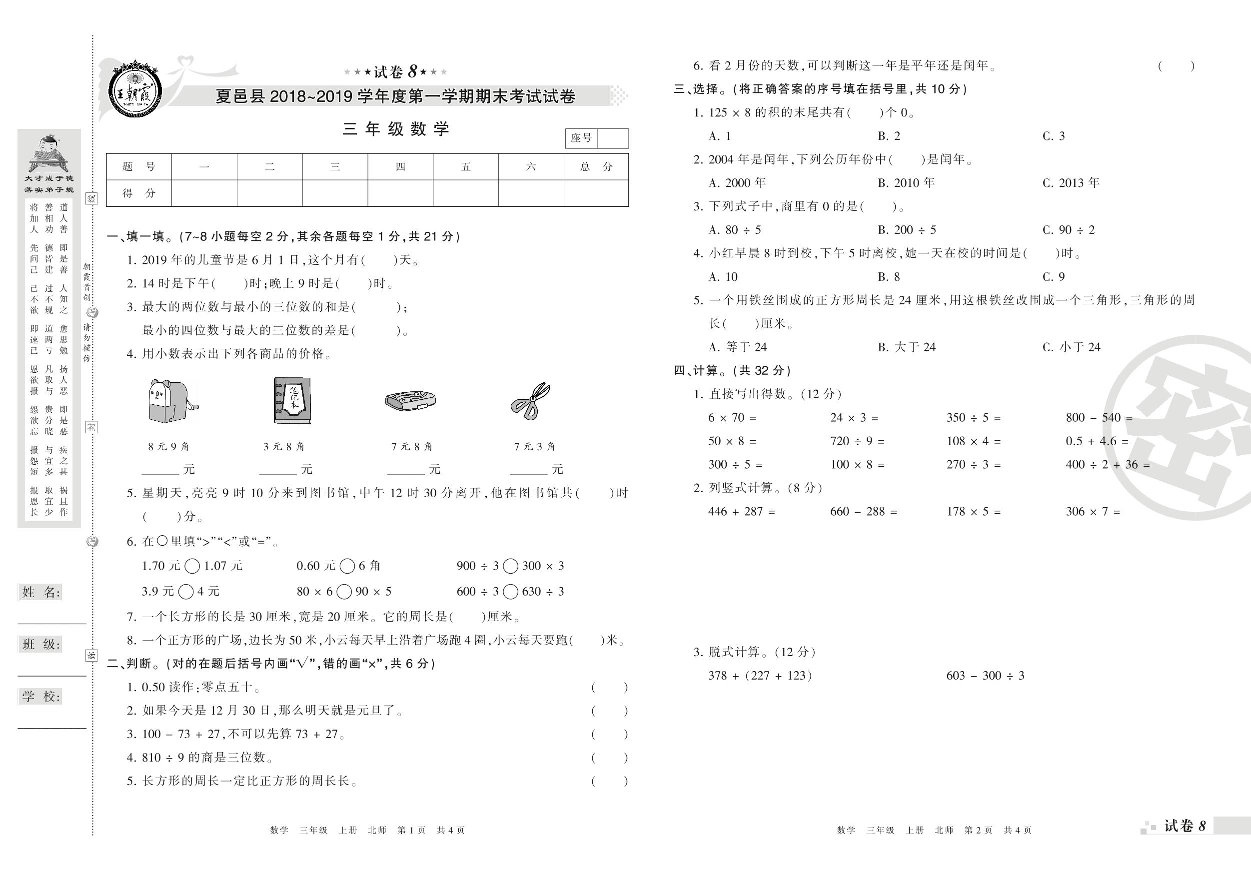 2018-2019学年第一学期商丘市夏邑县三年级数学试卷(北师版)【8】