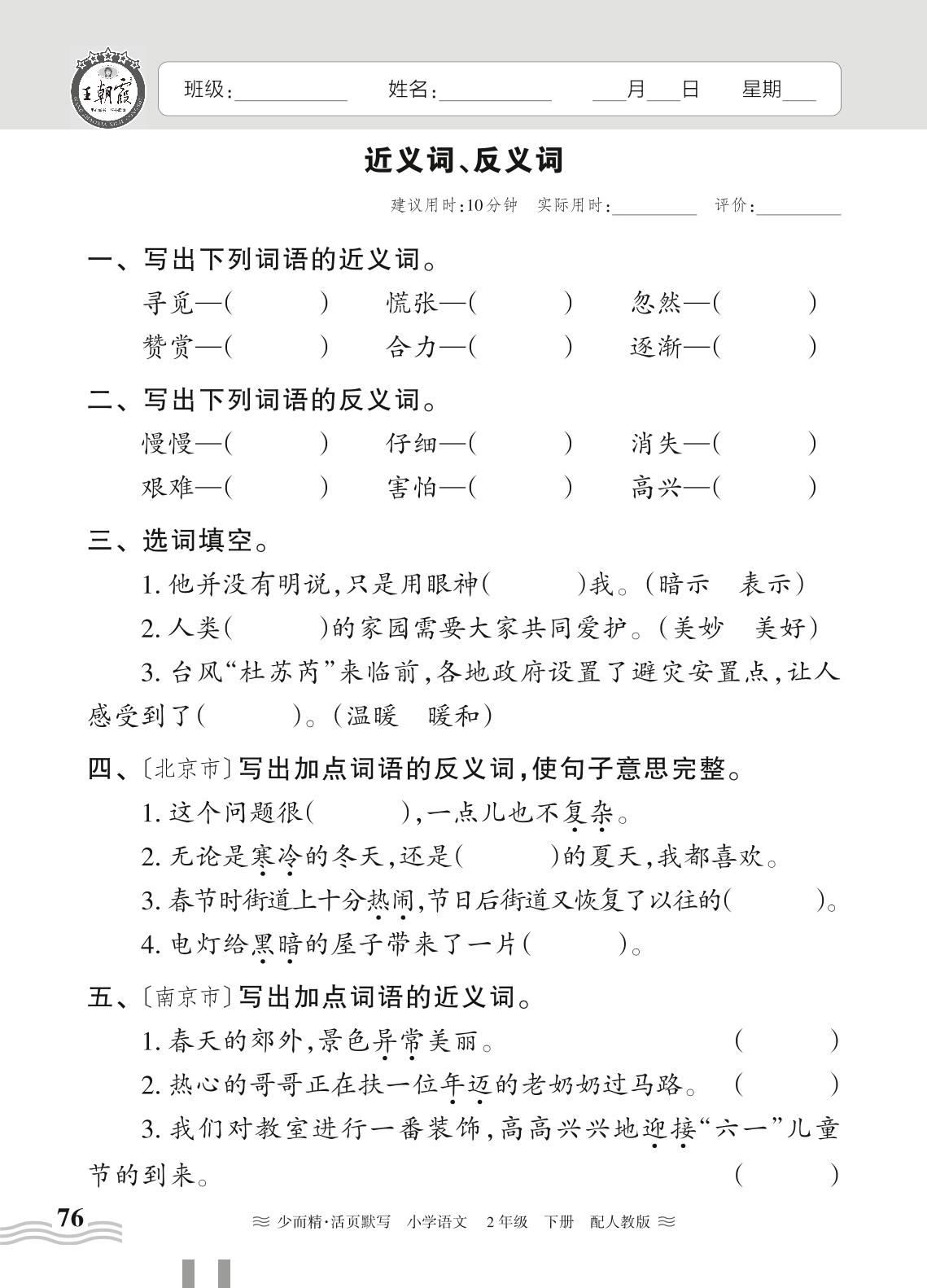 2024春下册二年级语文人教版 期末真题归类复习——近义词、反义词