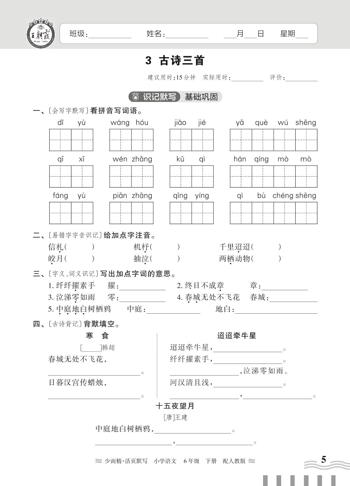 2024春下册六年级语文人教版 第一单元——3. 古诗三首