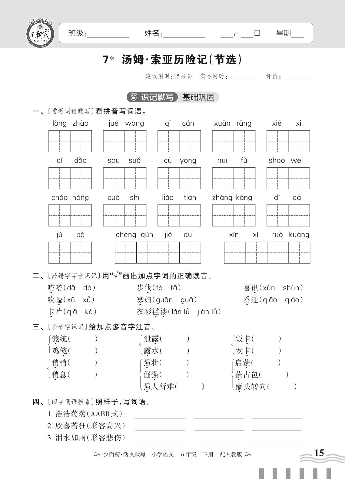 2024春下册六年级语文人教版 第二单元——7. 汤姆·索亚历险记(节选)